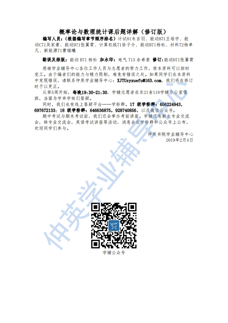西安交通大学概率论与数理统计课后题详解(修订版)猴哥6个月前更新关注私信1.02MB46页01.7W+4590西安交通大学概率论与数理统计课后题详解(修订版)此内容为付费资源,请付费后查看10积分年度会员免费月享会员免费登录购买付费资源已售 244 第1页 / 共46页 第2页 / 共46页 第3页 / 共46页 试读已结束,还剩43页,您可下载完整版后进行离线阅读 © 版权声明文章版权归作者所有,未经允许请勿转载。THE END《西安交通大学》期中期末历年真题期末试卷 文本预览 《概率论与数理统计》仲英学多辅导中心课后题(修订版)西安交通大学·仲英书院学业辅导中心出品 查看更多 收起部分 喜欢就支持一下吧点赞4590赞赏 分享QQ空间微博QQ好友海报分享复制链接收藏
