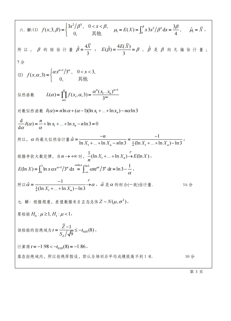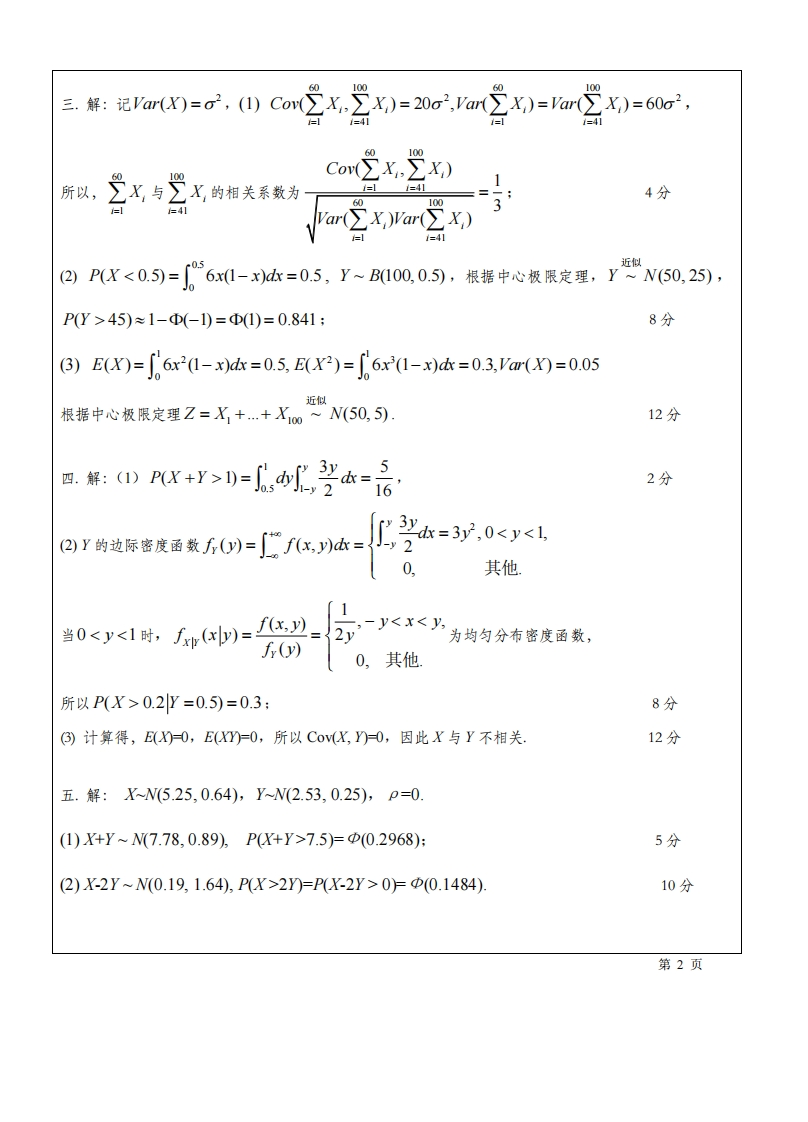 一.1.解:AUB表示选到二、三、四年级的女生,其概率为7/40.2解:()1-Cn/Cd,(2)m/a3.解:(1)X4~P2),P(X4≥1)=1-P(X4=0)=1-e2,(2)PX2=0)PY22D=1P(X4≥1)1+e4.解:P(4Y<1.5)=3/4,F1.5,0.5)=1/4.5.解:()~N(0,o2/4),P>o)=21-(2)》=0.046,②士N0,.X++、z③且相互袋立,5X,6四++疗队3c=5二.解:X的分布函数F(x)=1-e三,x>0,r的分有律P(=0=06P)=0.40,x≤0.侧=PW≤0=P吃es,当K0时,60侧=0,当≥12时,万仙=,当0sK120,u<0,1、1时,F(m=Pe方≤m)=PX≥-21n(2》=2u.即E(m=2,0≤w<4分21,u221根据全概率公式,F(v)=P(X+Y≤)=P(Y=O)P(X≤)+P(Y=1)P(X≤v-)「0,v<0,=0.61-e5,0≤v<1,10分--1-0.6e2-0.4e2,v21.第1页