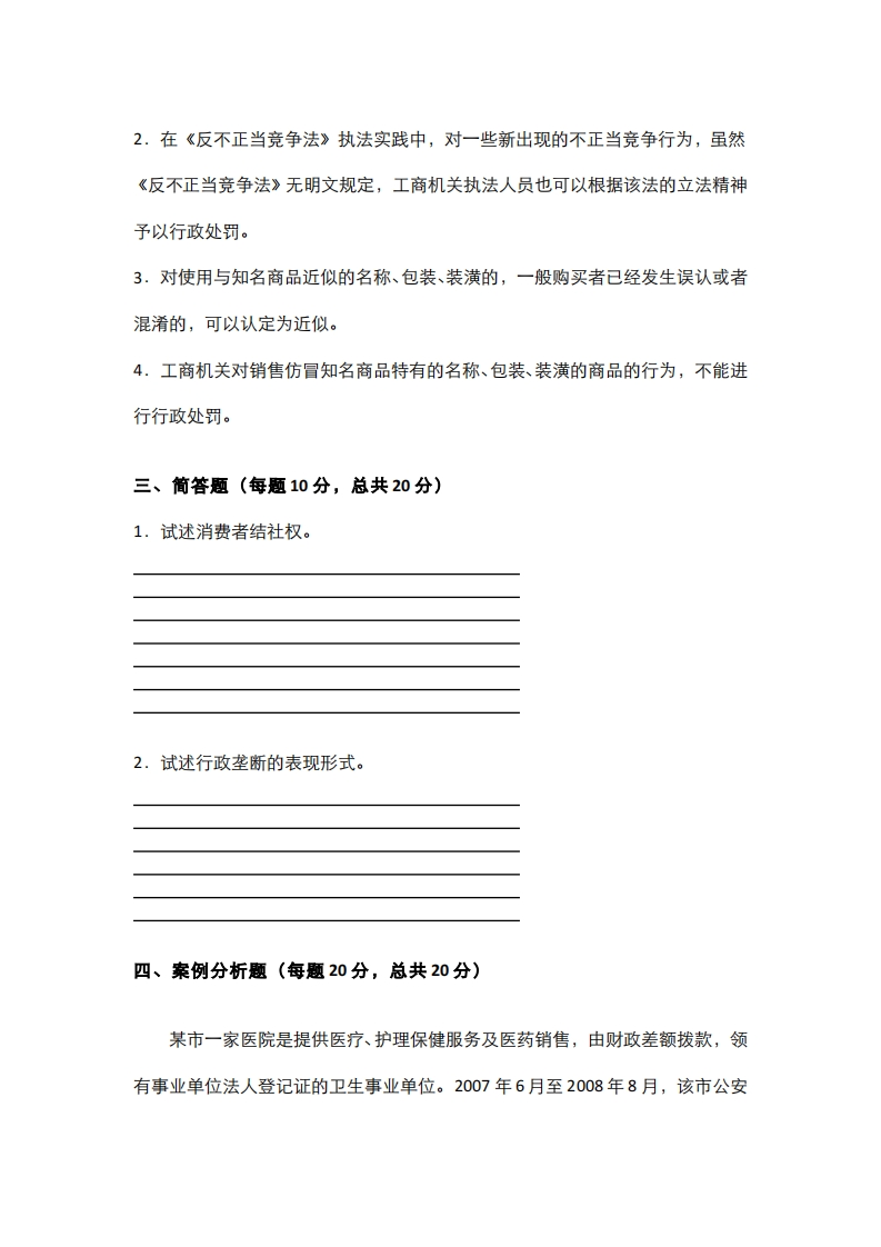 重庆大学《经济法》2020-2021学年期末真题试卷猴哥6个月前更新关注私信100.57KB4页01.4W+3940重庆大学《经济法》2020-2021学年期末真题试卷此内容为付费资源,请付费后查看10积分年度会员免费月享会员免费登录购买付费资源已售 183 第1页 / 共4页 第2页 / 共4页 第3页 / 共4页 试读已结束,还剩1页,您可下载完整版后进行离线阅读 © 版权声明文章版权归作者所有,未经允许请勿转载。THE END《重庆大学》期中期末历年真题期末试卷 文本预览 重庆大学2020-2021学年第二学期期末试卷《经济法》学院班级:学号姓名:题目三四五六七八九总分得分阅卷一、名词解释(每题10分,总共40分)1.自然垄断2.相关市场3.混淆行为4.变相广告宣传行为二、是非题(每题5分,总共20分)1.只有具备合法的市场经营主体资格的经营者才能成为不正当竞争行为的主体。 查看更多 收起部分 喜欢就支持一下吧点赞3940赞赏 分享QQ空间微博QQ好友海报分享复制链接收藏