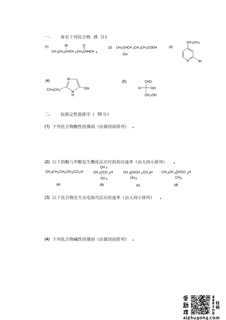 北京大学化学学院考试专用纸姓名:学号:考试类别:A卷考试科目:有机化学B考试日期:2014,6,18阅卷教师:期平题号三四五六末成绩中成总成绩绩装订线内分数北京大学考场纪律1、考生进入考场后,按照监考老师安排隔位就座,将学生证放在桌面上。无学生证者不能参加考试;迟到超过15分钟不得入场。在考试开始30分钟后方可交卷出场。2、除必要的文具和主考教师允许的工具书、参考书、计算器以外,其它所有物品(包括空白纸张、手机、或有存储、编程、查询功能的电子用品等)不得带入座位,已经带入考场的必绩盗篷气蔬置。页不要答题3、考试使用的试题、答卷、草稿纸由监考人员统一发放,考试结束时收回,律不准带出考场。若有试题印制问题请向监考教师提出,不得向其他考生询问。提前答完试卷,应举手示意请监考人员收卷后方可离开;交卷后不得在考场内逗留或在附近高声交谈。未交卷擅自离开考场,不得重新进入考场答卷。考试结束时间到,考生立即停止答卷,在座位上等待监考人员收卷清点后,方可离场。4、考生要严格遵守考场规则,在规定时间内独立完成答卷。不准交头接耳,不准偷看、夹带、抄袭或者有意让他人抄袭答题内容,不准接传答案或者试卷等。凡有违纪作弊者,一经发现,当场取消其考试资格,并根据《北京大学本科考试工作与学术规范条例》及相关规定严肃处理。5、考生须确认自己填写的个人信息真实、准确,并承担信息填写错误带来的切责任与后果。学校倡议所有考生以北京大学学生的荣誉与诚信答卷,共同维护北京大学的学术声誉。爱助攻蓝者更多科目扫码zhugong.com