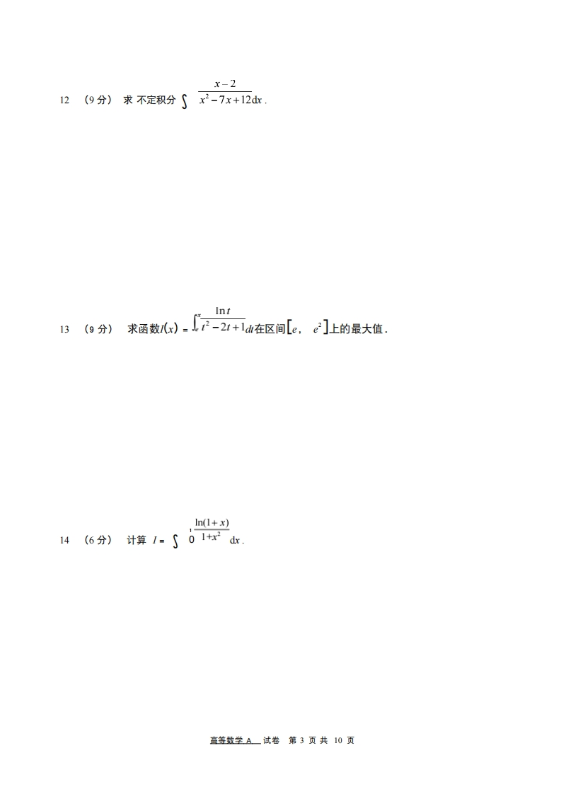 北京工业大学2020-2021学年第二学期高等数学(A)试卷(A)考场」院(系)班级学号姓名试卷卷面成绩占课程考核平时成绩课程考.占20%核成绩成绩80%题号二三四小计得分五阅卷校对说明:1、要求正确地写出主要计算或推导过程,过程有错或只写答案者不得分;2、考场、学院、班、学号、姓名均需写全,不写全的试卷为废卷:3、涂改学号及姓名的试卷为废卷;4、请在试卷上答题,在其它纸张上的解答一律无效一、填空题(每小题3分,共15分)鼻觉道守考试规则,诚信考试。绝不作得分蘿线内不假L,x+0小1.若函数f(x)=了在x=0处可导,则正整数k的最小值为L0,x=0∫arctan2'td2.卿。+.3x-2),f'(x)=arctanx2,d山3.已知y=f求3x+2dxx+2a4.已知x,x-2a)=2008,求15i设/网=a,a>0.a+.则m产n10r20ym1高盖数学A一试卷第1页共10页