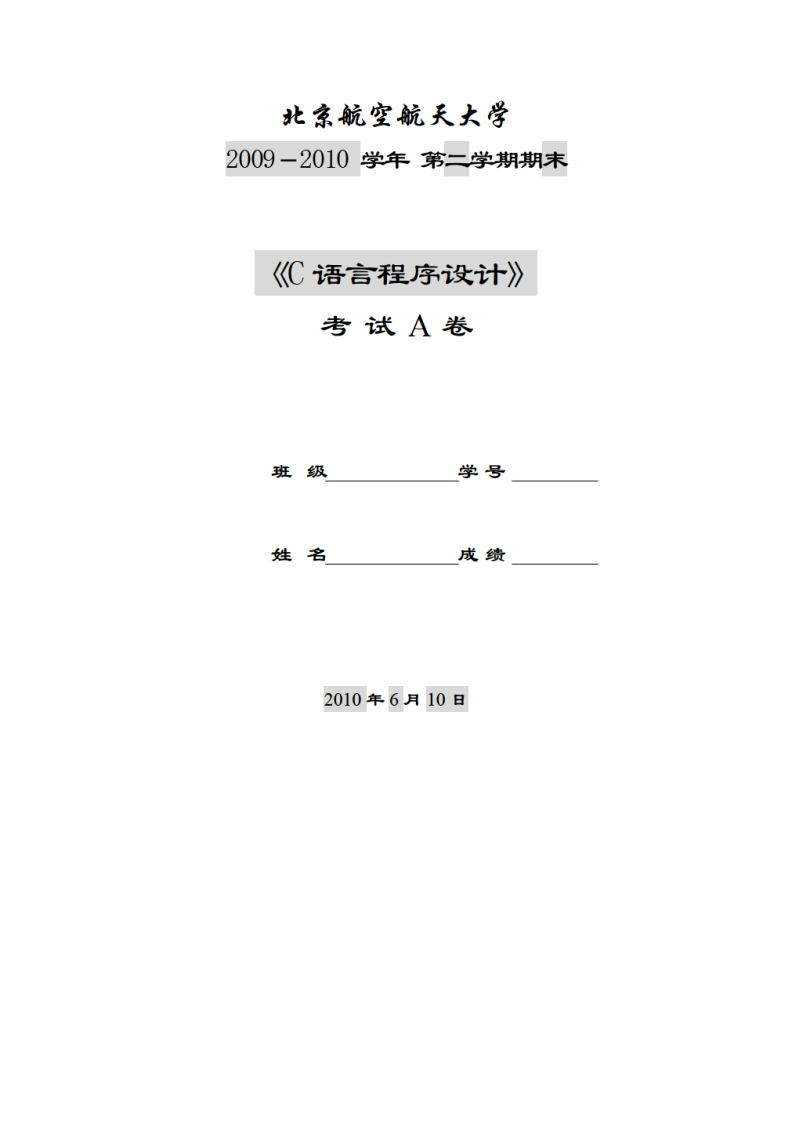 一、参考答案:选择题:1--5ADDAA6—10DACBD1115CA CBC16--20BBDAB二、填空题:1)92)203)>4)1010915)a=2,b-16)47)1.0/i*)或1/(aoat)i*i)8)void fun(double b[][22]void fun(double b[o][22])void fun(double (*b)[22])9)892110)n11)if(i%8=0)printf("n");12)0'或013)bd14)person[i].sex15)1230三、程序编写题1.求s=a+aa+aaa+aaaa+aa..a的值,其中a是一个数字。例如2+22+222+2222+22222(此时共有5个数相加),几个数相加由键盘控制。程序源代码:main()rint a,n,count=1;long int sn=0,tn=0;printf("please input a and nn");scanf("%d,%d",&a,&n);printf("a=%d,n=%dn",a,n);while(count<=n)rtn=tn+a;sn=sn+tn;a=a*10;++count;}printf("a+aa+...=%ldn",sn);10