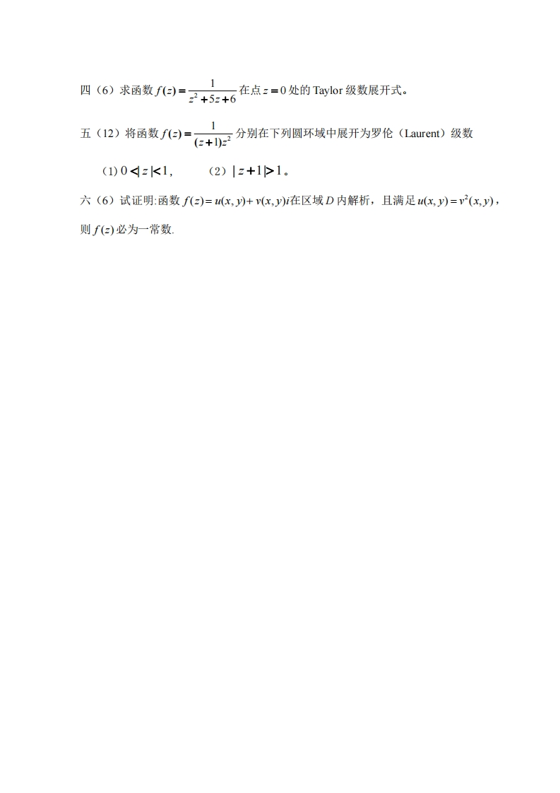 课程编号:07000048北京理工大学2016一2017学年第一学期2015级复变函数与积分变换试题A卷班级姓名学号成绩题号二三四五六总分得分一(10)(1)求区域{zz-ik1}在映射w=2(z+)下的像。2)求函数f(2)=xy2-x2y1在复平面上的可导点及解析点。二(6)求解析函数f(z)=u+m满足:(x,y)-(x,)=x2-y2-2xy.三(60)计算下列积分:(1)R()dz,其中积分路径C分别为1)连接点z=0与z=2+i的直线段:2)连接点z=0与点z=i直线段以及连接点z=i与点z=2+i的直线段所组成。1(2)dz(3)4)∫d(5)民2(2-3)(25-)(6)5-4cosx0(7)x2x(x2+12(8)1d也(9)21=2