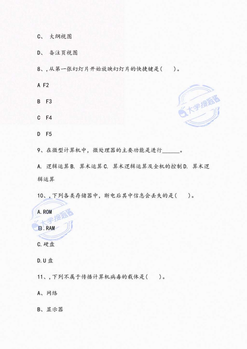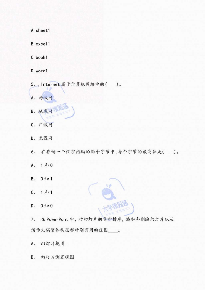 北京体育大学《大学计算机基础》2021-2022学年第一学期期末试卷_14090578猴哥6个月前更新关注私信0.64MB11页086742511北京体育大学《大学计算机基础》2021-2022学年第一学期期末试卷_14090578此内容为付费资源,请付费后查看10积分年度会员免费月享会员免费登录购买付费资源已售 170 第1页 / 共11页 第2页 / 共11页 第3页 / 共11页 试读已结束,还剩8页,您可下载完整版后进行离线阅读 © 版权声明文章版权归作者所有,未经允许请勿转载。THE END期末试卷 文本预览 北京体育大学大学计算机基础期末试卷学校班级姓名分数一、单选题(每小题1分)1、计算机中的最小的数据单位是()A、字节B、位C、字D、字符2、计算机软件系统应包括A.系统软件和应用软件B.编辑软件和连接程序C.程序和数据D.数据软件和管理软件3、单击动作按钮其能结束幻灯片放映,则应设置“动作设置”对话框中的(○}:A对象功作三得福B.超链接到C.运行程序D.以上都不对4、Excel中创建一个工作簿,通常默认命名为() 查看更多 收起部分 喜欢就支持一下吧点赞2511赞赏 分享QQ空间微博QQ好友海报分享复制链接收藏