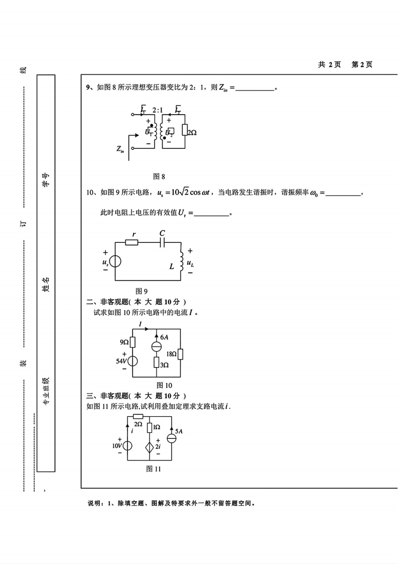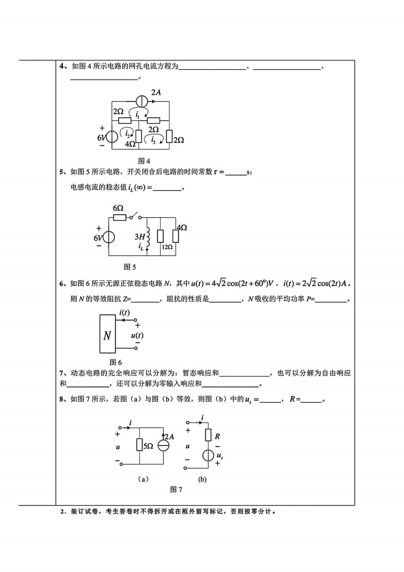 共2页第1页年月日北京邮电大学课程考试试题考试用(2020-2021学年度第二学期)课程名称:电路分析基础A试卷类型:(A、B、C)题号二三四五六七八九总分靠得分阅卷人一、填充题。本大题共10小题,每空2分,总计40分。(注:请将答案填入题干中的各横线上方)1、如图1所示电路中电压u与电流i是(关联、非关联)参考方向,此时,元件提供的功率p=毁☐u-图12、如图2所示电路,端口b的等效电阻R,=2。图23、如图3所示电路,电流=Ao图3说明:1、除填空题、图解及特要求外一般不留答题空间。