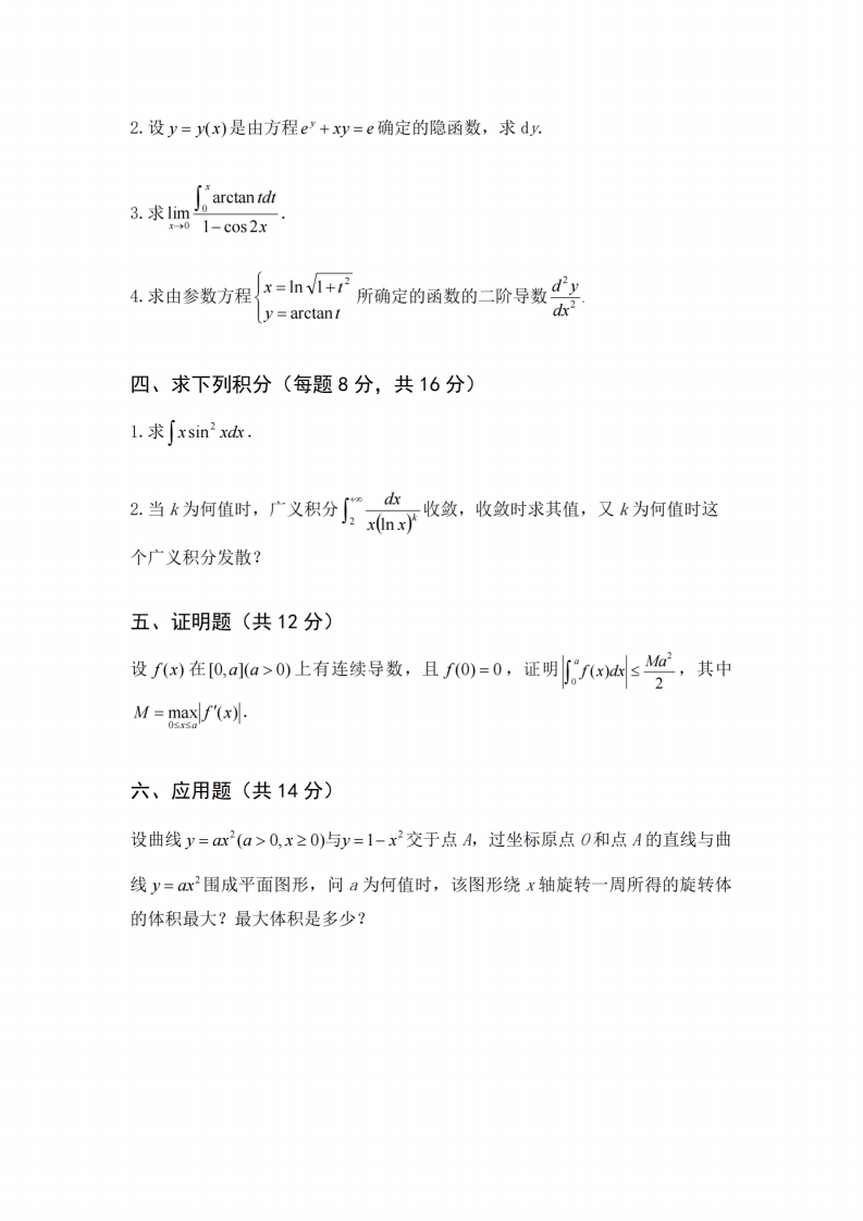 大连海事大学2022-2023学年第一学期《高等数学》试卷(A)专业班级:学号:姓名:题号三四五六总分得分一、选择题(每题3分,共15分)1.设f(x)连续、三阶可导,且f'(xo)=f"(x)=0,f"(xo)>0,则()(A)f'(x)是f'(x)的极大值(C)f(x)是f(x)的极大值(B)f(xo)是f(x)的极小值(D)(xo,f(x。)是曲线y=f(x)的拐点2.直线+2y与直线,=y=的位置关系是()2y-2=12(A)相互垂直(B)相互平行但不重合(C)重合(D)既不平行又不垂直3反常积分∫,n+》dr的被积函数的瑕点为()(A)x=0(B)x=0、x=-1(C)x=-1(D)没有瑕点4.设x→0时,e-1与2x相比较是()无穷小。(A)等价(B)同阶(C)低阶(D)高阶5.函数y=x arctanx在定义区间上是()(A)单调增加(B)单调减少(C)图形是凹的(D)图形是凸的二、填空题(每题3分,共15分)x2-11.已知fx)x+1-2
