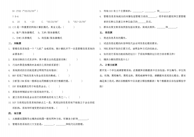 A、确定系统边界B、确定系统内部关系大连海事大学管理信息系统2018-2019学年C、确定系统与外部的联系D、确定系统子系统的划分3.下列工作哪些都属于管理信息系统实旌阶段的内容?(第一学期期末考试试卷A、模块划分,程序设计,人员培训B、选择计算机设备,输出设计,程序调试C、可行性分析,系统评价,系统转换一、名问解释D、程序设计,设备购买,数据准备与录入1.应急维护4.系统分析报告的主要作用是(2.关系模型A,系统规划的依据B、系统实施的依据C、系统设计的依据D、系统评价3.数据模型的依据4供应链5制造资源计划5.系统调试时,当程序全部调试完成后,首先应作的事是(A、系统试运行B、系统正式运行C、编写程序文档资料D、系统交付使6.方法库用7。推理机6.下列()符号不能作为V1sua1 FoxPro中的变量名,8.商务活能A.ABCDEFG B.K1234 C.12ASD D.xyz9.人机接口7.将逻辑值赋给内存变量X的正确方法是()。10.网络营销A.X=”T”B.STORE"T"T0XCX=TUED.STOE.T.T0X二、选择题8.V1sua】F©x0中的索引文件分为单索引和复合案引文件,复合索引文件的扩1.在一个关系R中,所有的非关键字字段之间,不存在传递依赖关系,那么我门展名为()。称它是(A、第一范式B、第二范式A.ID X B.NDX C.EDX D.CDX9.执行下列三个命令后,输出结果是()。C、第三范式D、以上都不是A=CT0D(“05/23/99”)2.在系统设计中使用U/C矩阵方法的主要目的是(