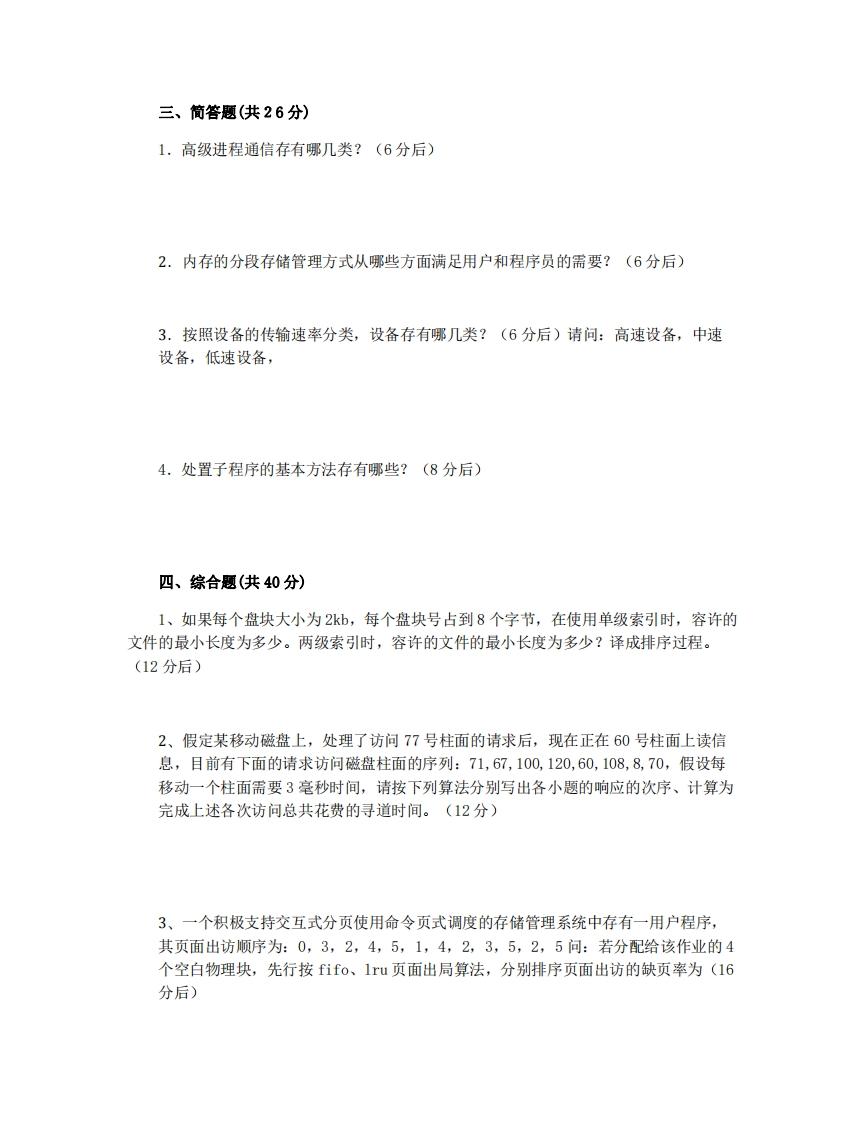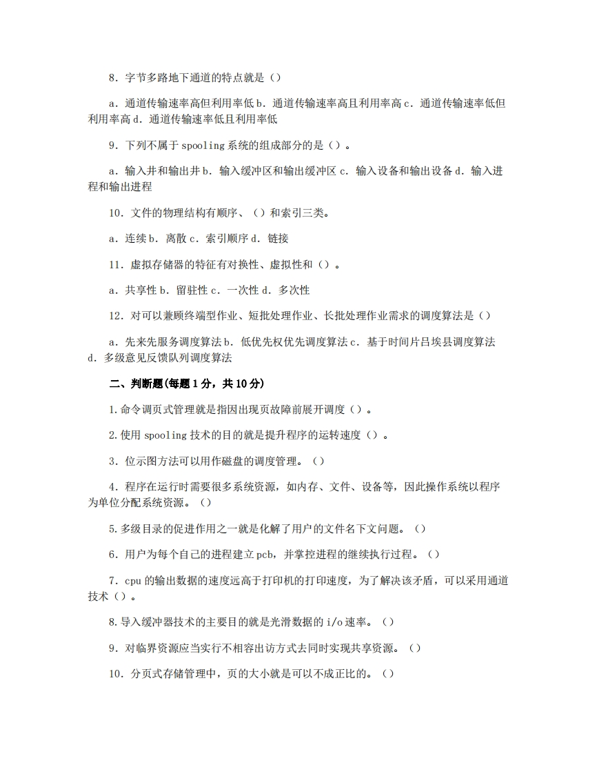 大连理工大学2022-2023学年第一学期期末考试考试科目:《操作系统》考试形式:闭卷考试时间:120分钟学年学期:2022-2023学年第一学期姓名:学院/系:计算机系学号:考试方式:闭卷年级专业:考试时长:120分钟班别:一、选择题(每题2分,共24分)1.在内存管理模式中,内存利用率最高的是()模式。a,分页管理b.分区管理c,分段管理d.段页式管理2.操作系统存有mammalian、共享资源、()和异步四大基本特性。a.交互式b.多路c.动态d.及时3.静态重定位就是在作业()中展开的a.编译过程b.装入过程c.链接过程d.执行过程4.分页式虚拟存储系统中,页面设置越大,可能将产生的缺页中断次数().越少b.越多c.维持不变d.不确认5.若信号量s的初值为4,当前值为-1,则表示有()个进程因s所代表的资源而阻塞等待。a.0b.1c.4d.56.可变分区方式管理主存时,往往采用()重定位方式来实现地址转换。.静态b.动态c,连续d.离散7.按文件中的数据形式分类,文件可以分成源文件、目标文件和()三类。a.系统文件b.用户文件c.可执行文件d.库文件