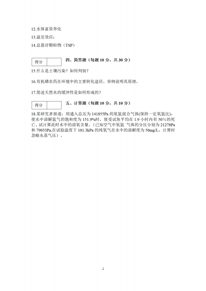 大连理工大学2020-2021学年第二学期期末试卷课程名称:环境化学满分:100分考试时间:120分钟考试类型:闭卷学号姓名班级题号三四五六七八九成绩满分2020203010100得分得分选择题(每题4分,共20分)1.具有温室效应的气体是()A甲烷、HOCO3、COB甲烷、SO2DCO2、SO22.伦敦烟雾事件成为(),美国洛杉机烟雾成()。A光化学烟雾B酸性烟雾C硫酸性烟雾D碱性烟雾3.根据Whittby三模态模型,粒径小于()m的粒子称为爱根核膜。A0.05B0.1D24.重金属从悬浮物或沉积物中重新释放属于二次污染问题,下例()原因可能诱发重金属释放。A颗粒物聚沉B降低水体的pH值C水流速度加快D富营养化加重5.下例吸附现象属于离子交换吸附的有()」A土壤胶体吸附碱土金属粒子B土壤颗粒吸附非离子有机化合物金属水和氧化物吸附过渡金属离子D腐殖质吸附非离子型农药得分二、填空题(每题4分,共20分)6.降水中主要的阴离子有7.污染物在环境中的迁移主要有和三种方式。8土壤是由气、液、固三相组成的,其中固相可分为和,两者占土壤总量的9.当降水的pH值时,称为酸雨。10.水中异养生物利用产生的有机物为能源及材料构成生命体;得分三、名词解释题(每题5分,共20分)11.生物富集