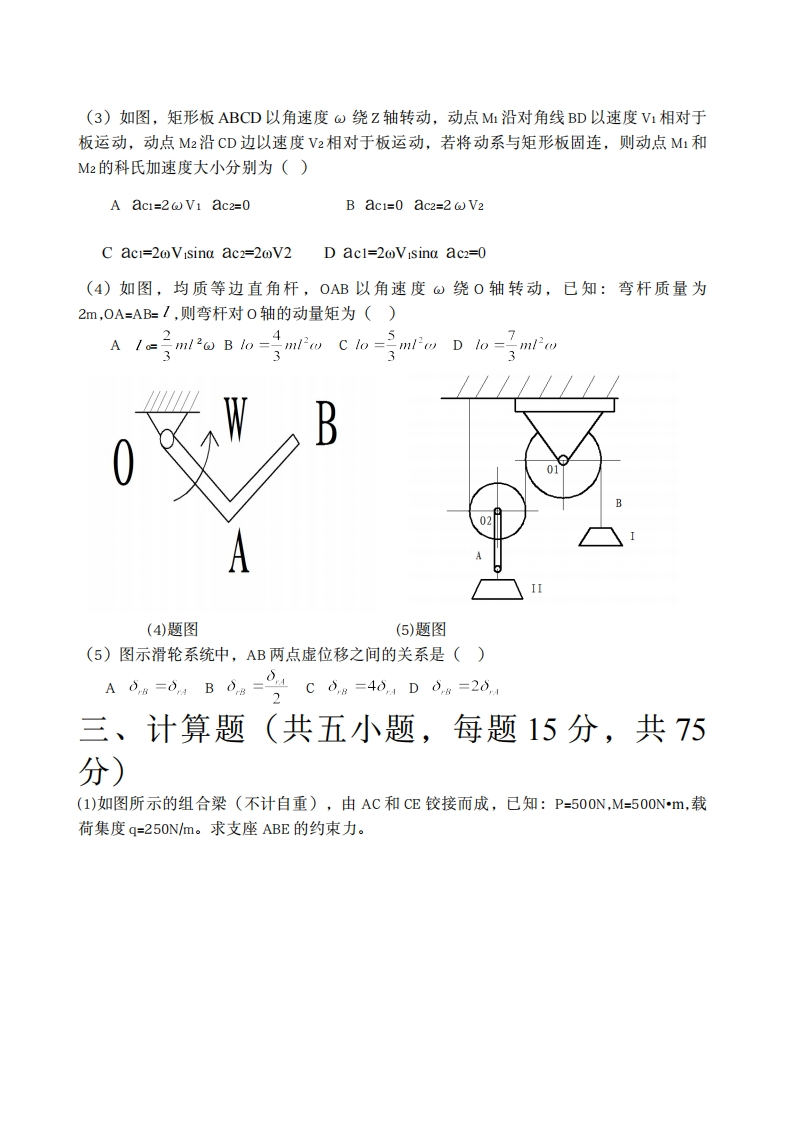 大连理工大学考试卷2017-2018第一学期班级学号姓名科目:理论力学一、判断题(每题二分,共十分)(1)某平面汇交力系的力多边形不自行封闭,则该力系一定不平衡。()(2)力偶的作用效果只取决于力偶矩的大小和转向。()(3)刚体做平移时,其上某点的运动轨迹不可能是空间曲线。()(4)系统广义坐标的个数等于系统的自由度个数。()(5)质点系动能的变化与作用在质点系上的外力有关,与内力无关。()二、选择题(每题三分,共十五分)(1)某平面任意力系向平面内任意一点简化的结果都相同,则此力系简化的最终结果为()A可能是一个力B可能是一个力偶,也可能平衡。C一定是一个力D一定平衡(2)直角弯杆(OA⊥AB⊥BC)的C端作用力F,已知:F=20N,OA=6m,AB=4m,BC=3m,a=30°,=60°则力F对Z轴的矩为()A Mz=0 B Mz=55.28N-m C Mz=8.04N-m D Mz=15.36N*mZADv2m2B77(2)题图(3)题图