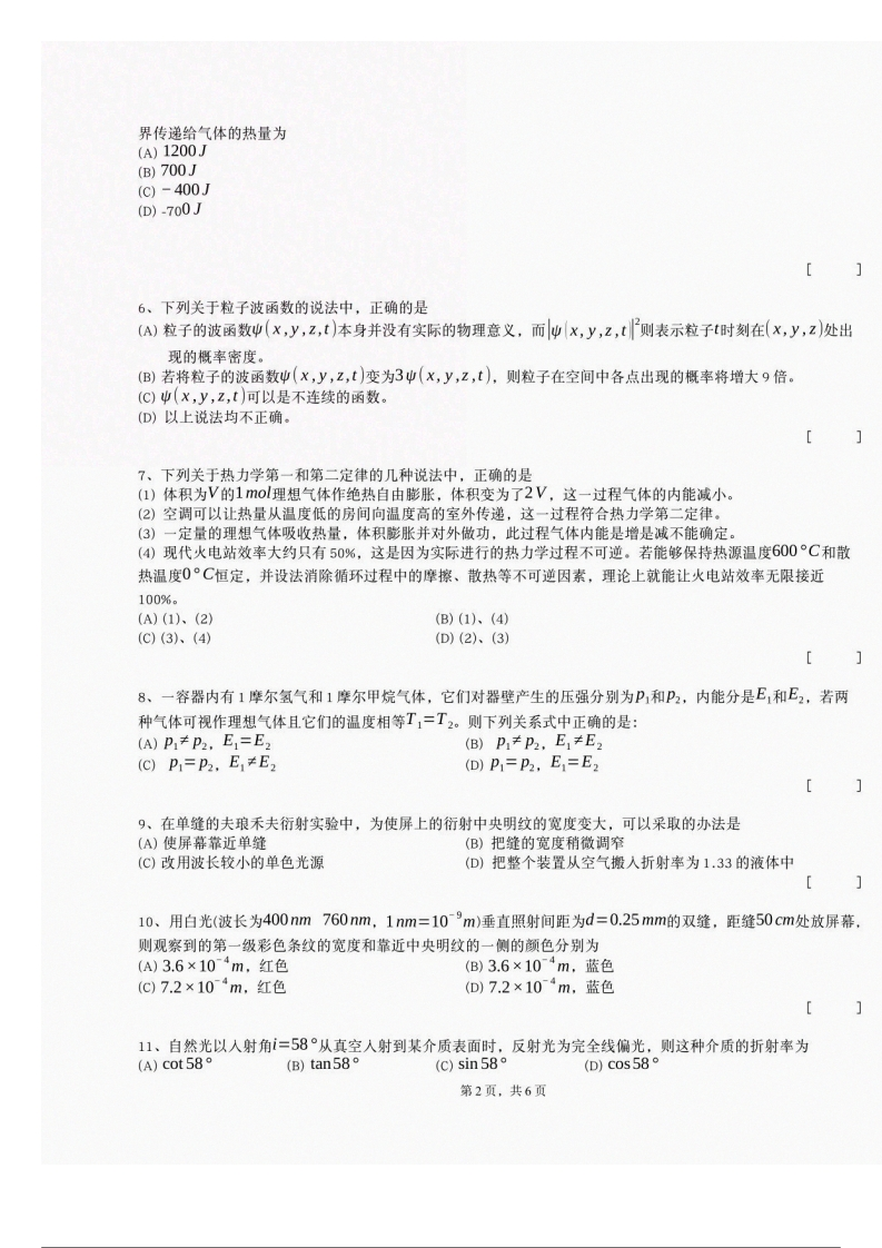 北京大学2020-2021学年第1学期期末考试课程名称:大学物理A2闭卷A卷120分钟三、计算题题号一、选择二、填空题题1234合计满分362410101010100实得分一、选择题(每题3分,共36分)1、如图所示,在一竖直悬挂的弹簧下系一质量为m的物体,再用此弹簧改系一质量为4m的物体,最后将此弹簧截断为两个等长的弹簧并联后悬挂质量为m的物体,则这三个系统振动的周期值之比为A(A)1:2:V1/21号24m▣o1:2D)12:4画2、一弹簧振子作简谐振动,当其偏离平衡位置的位移的大小为振幅的1/4时,其动能为振动总能量的(A)716(B)9116(C)11/16(D)13/16(E)15/163、如图所示,平板玻璃和凸透镜构成牛顿环装置,全部浸入折射率n=1.60的液体中,凸透镜可沿O0'轴移动,用波长入=500m(1nm=109m)的单色光垂直入射。从上向下过观察,看到中心是一个暗斑,此时凸透镜顶点距平板玻璃的距离最少是(A)156.3nm(B)148.8nm=1.68(c)78.1nm(D)74.4nmx21.60(E)Onmn=1.584、一束光是自然光和线偏振光的混合光,让它垂直通过一偏振片。若以此人射光束为轴旋转偏振片,测得透射光强度最大值是最小值的5倍,那么入射光束中自然光与线偏振光的光强比值为(A)1/2(B)1/3(C)1/4(D)1/5p(×103Pa)5、一定量的理想气体经历acb过程时吸热500J.则经历acbda过程时,外第1页,共6页y(×103m)