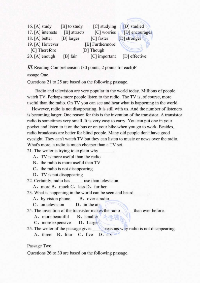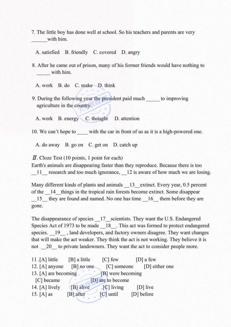 东北电力大学《大学英语》2019-2020学年第二学期期末试卷PART ONEI.Choose the best answer to complete each of the following sentences (10 points,1point for each)1.We promise that we'll meet again after we our college education in threeyears'time.A.finish B.will inish C.have finished D.will have finished2.she didn't like the teacher,she shouldn't have stayed away from the class.A.Because B.However C.even if D.As3.You'll fail in the driving testyou have more practice.A.if B.unless C.when D.after4.When Leninin Europe he began to fulfill his plans step by step at once.A.got B.arrivedC.reached D.went5,He has been置a visit to his teacher each month for many years ever sincehe graduated.A.paying B.having C.doing D.holding6.I don't hate housework.As a matter of fact,I'm very fondhousework,especially cooking.A.in B.of C.at D.for