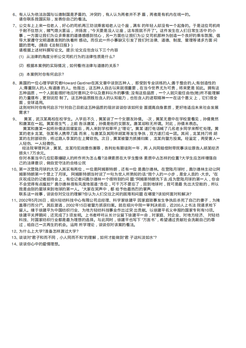 东北师范大学2016-2017学年第二学期思想道德与法治期末试卷论文材料(任选一篇)1、王选,男,汉族,江苏无锡人,1937年2月生于上海,1958年毕业于北京大学数学力学系。荣获2001年度国家最高科学技术奖,2003年当选十届全国政协副主席。作为当代中国知识分子的杰出代表,大学生成长的楷模。当有人问他成功的感受时,王选教授曾经用“我的八个重要选择"总结自己的人生之路。下面是王选的第一次选择。“人的一生会碰到很多机会,但机遇只偏爱有准备的头脑。多方面的知识和实践经验,对社会需求(包括未来需求)的敏感,对技术发展方向的正确判断,一丝不苟和锲而不舍的精神,都有助于把握机遇,取得成功。风风雨雨几十年来,我经历了多次人生抉择,每一次都给我带来非凡的意义,甚至命运的转折。1954年我高中毕业报考大学,由于对数学的喜爱,填了三个志愿:北京大学数学力学系、南京大学数学系、东北人民大学现吉林大学)数学系。后来顺利考取了北大。到了二年级下学期,我们开始分专业-选择正确的专业往往对一个人的发展方向起非常关键的作用。当时数学系有数学、力学和计算数学三个专业,数学专业作为一门古老而又成熟的学科,散发着迷人的光彩,大多数成绩好的同学选择了它。相比之下,计算数学专业则是北大刚刚成立的新兴学科,不但没有一套像样的教材,而且应用性强,不见得有多高深的学问,所以许多人不愿问津。我却有不同想法,越是古老成熟的学科,越难以取得新的突破:而新兴学科往往代表着末来,越不成熟,留给人们的创造空间就越广阔。恰好这时,我看到了1956年1月制定的国家“十二年科学发展远景规划”周恩来总理讲了几个未来重点发展学科,其中就包括计算技术,这对我真是一个很大的鼓舞。我又留意了报刊上一些有关计算机的报道和论述,发现计算机在未来将对人类产生巨大神奇的作用。我就想,一个人必须把自己的事业和前途同国家的前途命运联系在一起,才有可能创造出更大的价值奉献于社会。就这样,我下决心选择了计算数学专业,这是我一生中第一次大的抉择。实践证明,这一选择是完全正确的,它为我今后的科研工作奠定了第一块基石。作家柳青曾经说过:“人的一生很漫长,但关键的只有几步”。青年时期确定一个人的人生目的和发展方向对于人生是否成功至关重要。从王选对自己人生之路的分析、选择,我们看出,他没有人云亦云,随波逐流,而是结合社会的发展,把自己的事业和前途同国家的前途命运联系在一起,确定自己的努力方向,并为之艰苦奋斗,百折不挠,在为社会服务中实现了自己的价值,走向了成功。阅读材料,结合个人经历,写一篇论文,谈谈你对人生价值的认识,人人怎样才能实现自己的人生价值。22001年12月23日,原告蒋蹈看到《成都商报》上刊登《中国人民银行成都分行招录行员启事》,其中第一条“招录对象"规定:2002年普通高等院校全日制应届毕业生具有大学本科及以上学历的经济、金融、计算机、法律、人力资源管理、外语等专业的学生。男性身高在168公分、女性身高在155公分以上.生源地不限。"原告是四川川大学法学院1998级学生,认为成都分行的上述规定,是对包括自己在内的仅因身高不符合上述条件的报名者的身高歧视侵犯了原告享有的宪法赋予的担任国家公职的平等权。虽然被告在法院受理此案以后,改变了被诉行为,取消了身高限制规定,但与原告诉请法院审查的行为无关,更不能配改变被诉行为的违法、侵权性质。综上所述,请求法院依法确认被告的被诉具体行政行为违法、被告停止发布该内容的广告等。此案于2002年1月7日由成都市武侯区人民法院受理。同年4月25日,此案在武侯区人民法院开庭审理,控辩双方在庭上围绕“原告宪法所赋平等权等焦点激烈辩论,庭审历时3小时,法庭宣布“择日公布再审或宣判日期”。同年5月月5日,成都市武侯区人民法院做出判决:驳回蒋蹈的起诉。法院做出驳回原告起诉裁定的理由有二:一是中国人民银行成都分行招录行员行为不是其作为金融行政管理机关行使金融管理职权、实施金融行政管理的行为,因此,不属于被告的行政行为范畴,依法不属于人民法院行政诉讼的主管范围:二是被告的这一行为在作出时并末对外产生拘束力或公定力。该行为的效力只有在招录行员的报名期间即2002年1月11日至17日"这期间才产生。而被告成都分行在该行为产生效力之前就已自行修改了《招录行员启事》内容撤销了对招录对象的身高条件规定消除了该行为对外部可能产生的法律后果和对相对人的权利义务产生的实际影响。因此被告的行为实际上并未给原告及其他相对人报名应试的权利造成损害。原告蒋韬所称的侵权事实是尚未发生的事实,不具有可诉性。此案被蒋韬的代理人、周伟教授称为“中国法院受理的宪法平等权利的第一案。阅读材料,结合身边实例,写一篇论文,谈谈你对公民宪法权利的认识,对我国法治发展状况,以及如何加强社会主义法治建设的认识3、一个中国留学生,为日本餐馆洗盘子。日本餐饮业规定,盘子必须洗七遍。这位留学生却很“聪明地少洗两遍,工钱自然也挣了不少。餐馆老板发现了问题,把他辞退。他又到该社区的另一家餐馆应骋洗盘子。这位老板打量了他半天,才说:“你就是那位只洗五遍盘子的中国留学生吧。对不起,我们不需要"