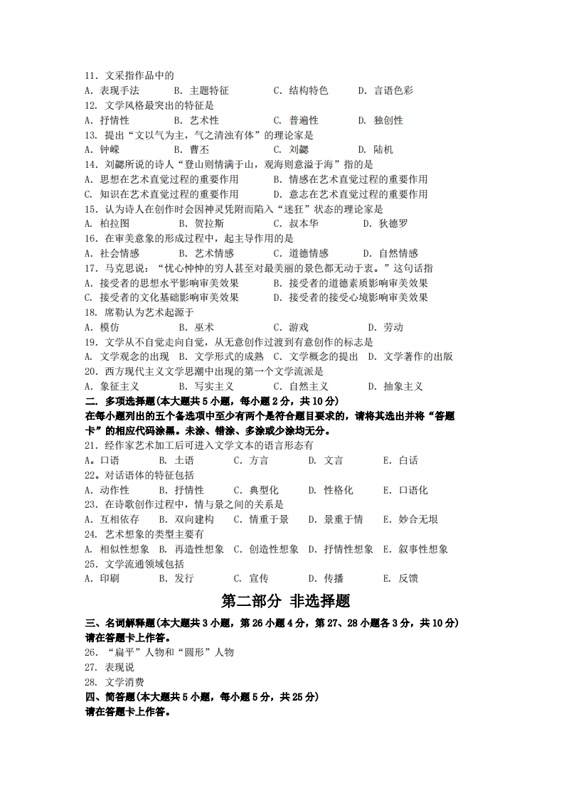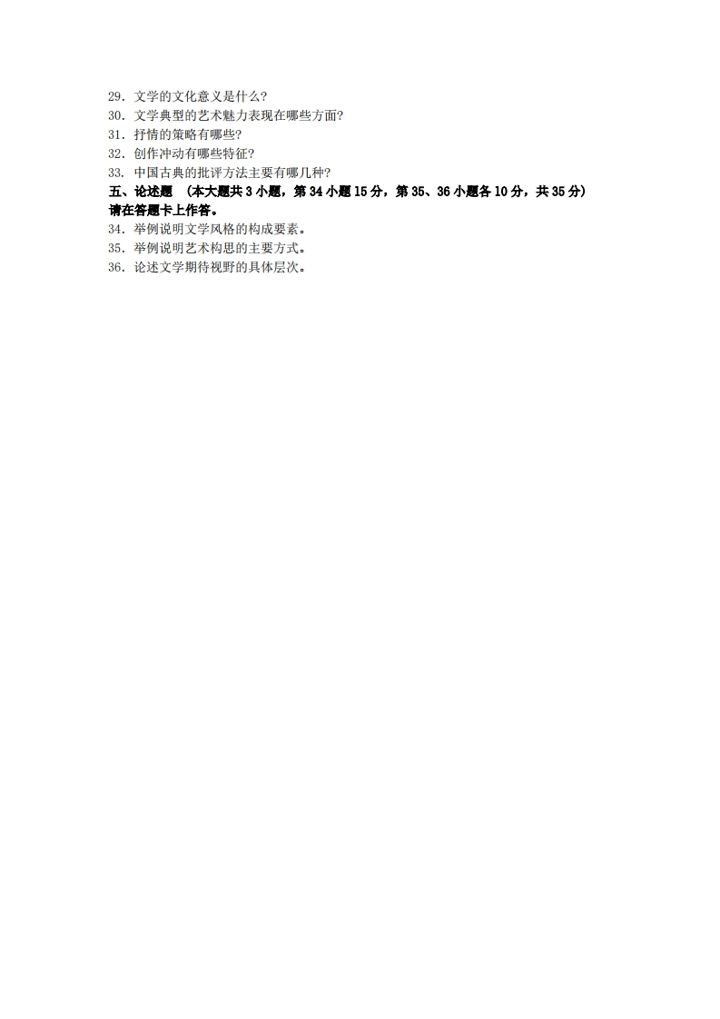 东北师范大学《文学概论》2022一2023学年第一学期期末试卷专业类别:考试日期:考生姓名:学号:本试卷共3页,满分100分,考试时间150分钟。考生答题注意事项:1.本卷所有试题必须在答题卡上作答。答在试卷上无效,试卷空白处和背面均讨作草稿纸。2。第一部分为选择题。必须对应试卷上的题号使用2B铅笔将“答题卡”的相应代码涂黑。3。第二部分为非选择题。必须注明大、小题号,使用0.5毫米黑色字迹签字笔作答。4,合理安排答题空间,超出答题区域无效。第一部分选择题一、单项选择题(本大题共20小题,每小题1分,共20分)在每小题列出的四个备选项中只有一个是符合题目要求的,请将其选出并将“答题卡”的相应代码涂黑。未涂、错涂或多涂均无分。1.“体验说”在文学四要素中强调的是A.世界与作品的关系B.作家与作品的关系C.作家与读者的关系D.读者与作品的关系2.从作品的角度看,文学是A.一种语言艺术B.审美意识形态C.作家体验的凝结D.作者与读者沟通情感的渠道3.英加登所说的“未定点”是指A.作家打算写的东西B.有待读者具体化的东西C.作家没有写完的东西D.读者未读懂的东西4.文学语言组织的三个基本层面指A.语音层面、文法层面、辞格层面B.气韵层面、格律层面、文法层面C.想象层面、辞格层面、语音层面D.经验层面、想象层面、文法层面5.法国诗人马拉美说“诗永远应当是一个谜”,这句话体现了文学象征意象的A.无解性B.求解性C.可解性D.荒诞性6.从表意方式的角度,文学象征意象可分为A.寓言式象征意象与符号式象征意象B.寓言式象征意象与抽象式象征意象C.抽象式象征意象与具象式象征意象D.抽象式象征意象与符号式象征意象7.陀思妥耶夫斯基小说《罪与罚》第三章开头说:“他一夜没睡好,次日醒得很迟。”从叙述时间角度看,这种叙述属于A.省略B.概述C.减缓D.停顿8.文学艺术活动的主体调动过去积累的记忆表象,经过艺术加工创造出艺术形象的心理过程,叫做A.艺术灵感B.艺术想象C.艺术感觉D.艺术情感9.在西方,提出“交感说”并确立了象征主义抒情原则基调的是A.波德莱尔B.魏尔伦C.马拉美D.瓦莱里10.“有的人活着/他己经死了:有的人死了/他还活着。”这里使用的主要修辞策略是A.意象B.隐喻C.典故D.悖论