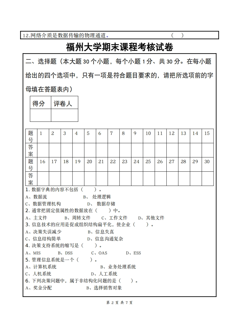课程名称管理信息系统考试日期2017.12考生姓名学号专业或类别题号二三四五六七八总分累分人题分1230182020100签名得分考生注意事项:1、本试卷共7页,请查看试卷中是否有缺页。2、考试结束后,考生不得将试卷、答题纸和草稿纸带出考场。一、判断题:请把答案写在答题表内正确在括号内打勾,错误在括号处打叉(每题1分,共12分)得分评卷人1.数据流程图的特性是具有抽象性和概括性。()2.系统分析阶段主要工作是:分析用户需求,了解新系统和当前现行系统的差别,明确新系统要“怎么做”。3.输出设计应按排在输入设计之前进行。()4.CS是由客户机、wb服务器、应用服务器构成。5.整个系统的数据关系图就是信息系统流程图。()6.概念模型描述的是从程序员角度看到的数据库。7.E-R图是刻画逻辑模型的主要工具。()8.数据结构包括数据的存储结构及在此结构上的运算或操作。9.数据项是数据组织的基本单位。10.MIS的成功应用必须以规范的管理为基础。11.CSF方法的核心是定义业务过程。第1页共7页
