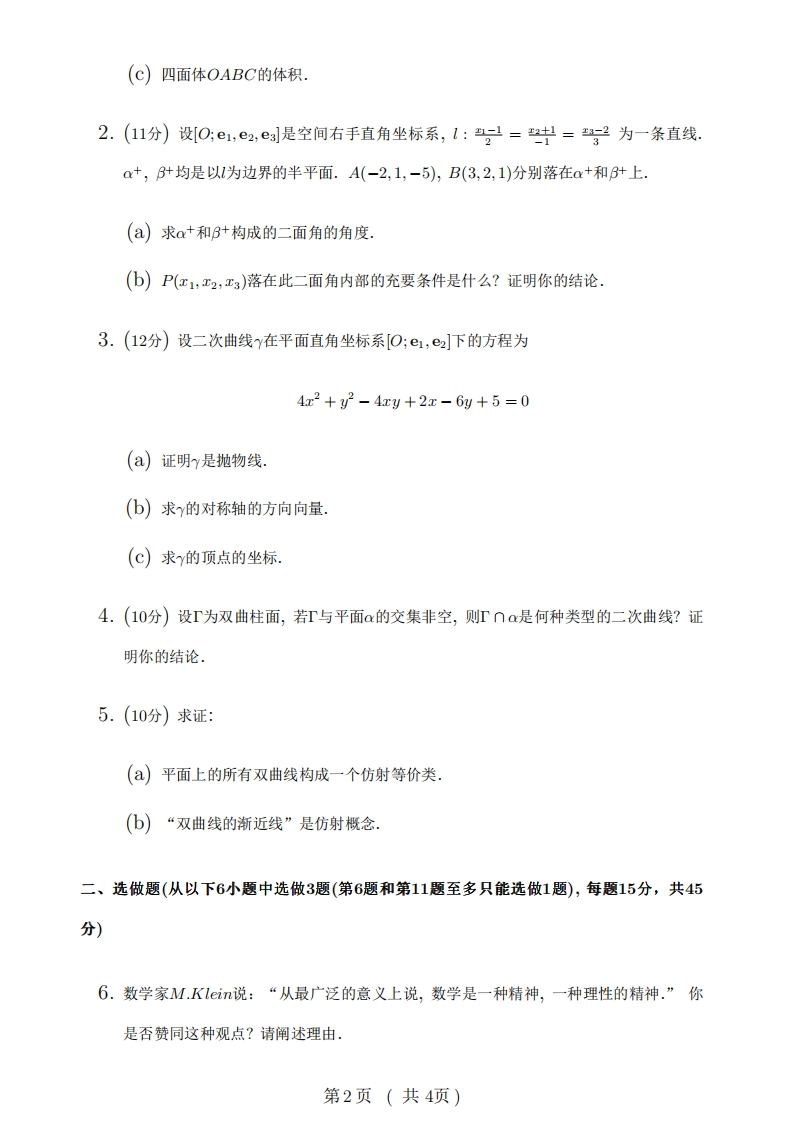 ,,,,复旦大学数学科学学院2020~2021学年第一学期期末考试试卷口A卷课程名称:高等代数与解析几何课程代码:MATH120010开课院系:数学科学学院考试形式:闭卷姓名:学号:专业:提示:请同学们秉持诚实守信宗旨,谨守考试纪律,摒弃考试作弊。学生如有违反学校考试纪律的行为,学校将按《复旦大学学生纪律处分条例》规定予以严肃处理。订线内不要答题题目2356得分题目7891011总分得分一、必做题(共55分)1.(12分)设[O:e1,e2,e]是空间右手直角坐标系,[O:f,2,f]是空间仿射坐标系.O',f1,f2,£在[O:e1,e2,e3]下的坐标分别为(1,0,0),(0,1,0),(-1,-2,0),(0,3,2)设A,B,C是空间中的3个点,在[O;f,,f3]下的坐标分别为(1,0,0),(1,1,0),(0,1,1):求:(a)A,B,C在O:e1,e2,e下的坐标.(b)ōA与0B的夹角第1页(共4项)