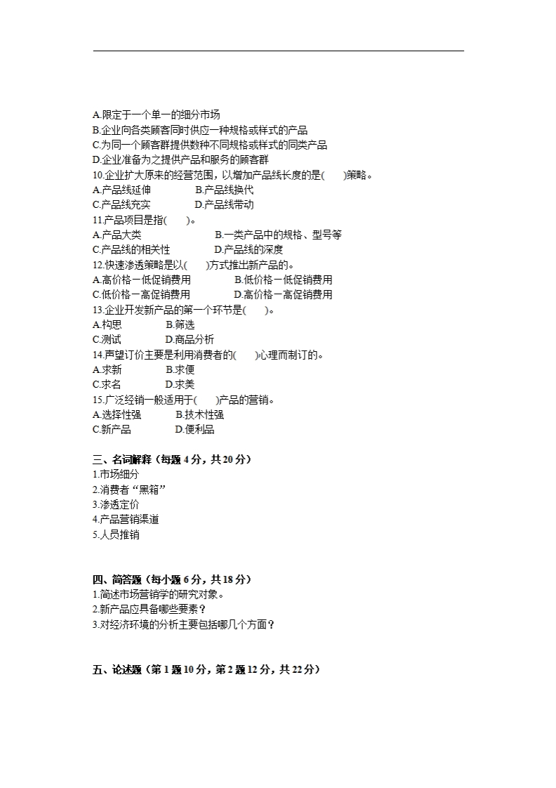 复旦大学《市场营销学》2022-2023学年第一学期期末试卷一、填空题(每空1分,共10分)1环境变化趋势可分为两大类,一类是另一类表现为2根据马斯洛的需要层次理论,人类的需要依次为生理需要、安全需要和自我实现的需要五个层次。3产品生命周期一般可分为四个阶段,即投入期和衰退期。4.消费品按其使用频率和形态可分为耐用消费品,和5企业采用俘虏产品订价,一般是将相关产品的一种定为,另一种定为】二、单项选择题在每小题的四个备选答案中,选出一个正确答案,并将正确答案的序号填在题干的括号内。每小题2分,共30分)1.生产经营新的产品投入新市场的方法称为(A市场渗透B.市场开发C产品开发D多种经营2.“酒香不怕港子深”、“一招鲜、吃遍天”等说法,反映了企业的(A生产观念B产品观念C推销观念D.市场营销砚念3.营业推广活动的特点是()。A艺术性强B.渗透性强C.针对性强D刺激性强4.生产资料购买活动类型中,最简单的购买活动是(。A新任务购买型B.直接重复购买型C.修正重复购买型D零星购买型5.市场补缺战略的主要特点是(A游击进攻B.紧密跟随C.专门化D.回避竞争6海外旅游公司是上海通用汽车公司的(A品牌竞争者B.行业竞争者C形式竞争者D.一般竞争者7.()是影响消费者需求和行为的最基本的因素。A文化B社会阶层C相关群体D家庭8要求细分出来的市场范围比较明晰,能大致判断该市场的大小,这是指市场细分原测中的()。A可测量性B实效性C.可进入性D.上述三者都不是9.目标市场是指(