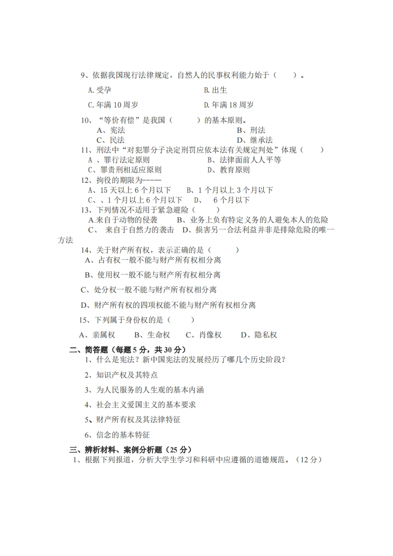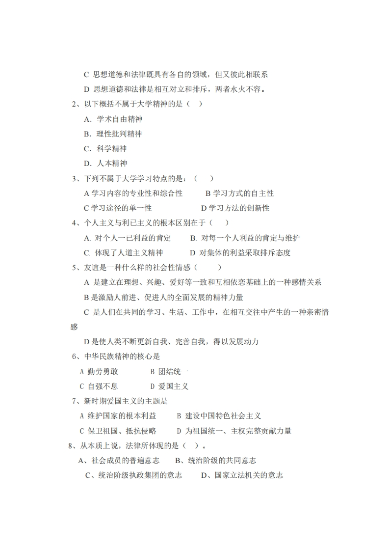 复旦大学《思想道德与法治》2017-2018学年期末试卷A猴哥6个月前更新关注私信1.74MB7页086792502复旦大学《思想道德与法治》2017-2018学年期末试卷A此内容为付费资源,请付费后查看10积分年度会员免费月享会员免费登录购买付费资源已售 105 第1页 / 共7页 第2页 / 共7页 第3页 / 共7页 试读已结束,还剩4页,您可下载完整版后进行离线阅读 © 版权声明文章版权归作者所有,未经允许请勿转载。THE END《复旦大学》期中期末历年真题期末试卷 文本预览 复且大学政治与公共管理学院2017--2018学年(上)《思想道德修养与法律基础》试卷(A)(注:答案都写在答题纸上,写在试卷上的答案无效。)一、选择题(单选,每题1分,共15分)1、、思想道德与法律之间的关系()A思想道德与法律是互不相关的两个学科领域,遵循不同的规律B思想道德和法律虽然都是社会主义意识形态内容,但遵循不同的规律 查看更多 收起部分 喜欢就支持一下吧点赞2502赞赏 分享QQ空间微博QQ好友海报分享复制链接收藏