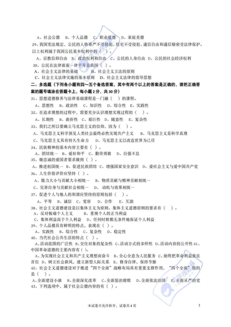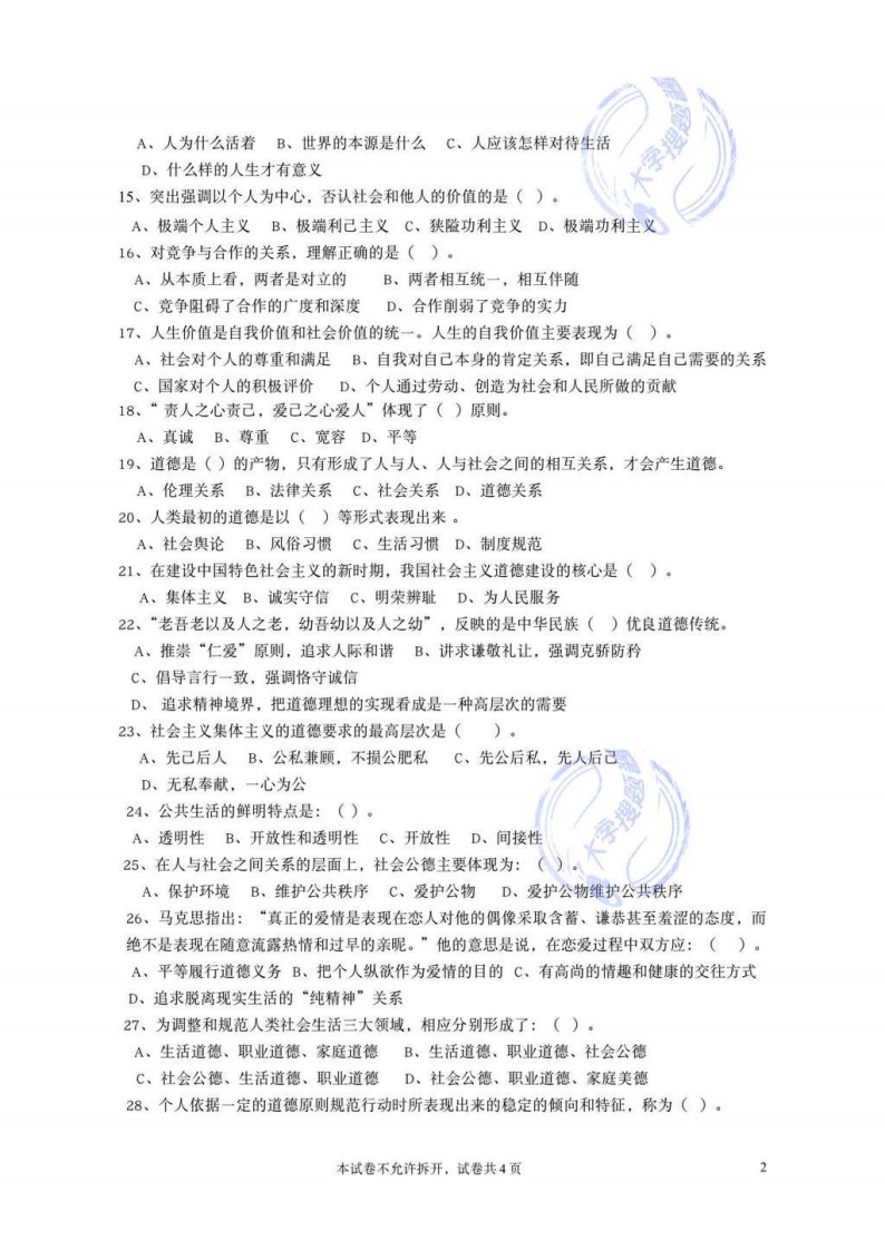 《思想道德修养与法律基础》试卷(说明:请把选择题答案填涂在答题卡上,主观题答案写在“赣南医学院考试答卷”纸上并标明题号,否则不得分。)一、单选题(每小题1分,共30分)1、当代大学生在确立成才目标一德智体美的时候,必须明确人才素质的综合体现是()。A、德B、智C、体D、美2、理想,是人们在实践中形成的()。A、有实现必然性的对美好未来的追求和向往B、不可实现性的对美好未来的追求和向往C、超越客观性的对美好未来的追求和向往D、有实现可能性的对美好未来的追求和向往3、理想的追求和实现是一个()。A、坐享其成的过程B、信手拈来的过程C、纵情享乐的过程D、艰苦奋斗的过程4、信仰是信念最集中、最高的表现形式,信仰有()A、科学的与人文的B、理性的与情感的C、科学的与非科学的D、宗教的与哲学的5、理想信念对每个人的人生意义重大,理想信念的作用主要表现在:指引人生的奋斗目标、提高人生的精神境界和()。A、使人生一帆风顺B、提高人生的知识含量C、提供人生的前进动力D、增加人生的财富水平6、孔子说“三军可夺帅也,匹夫不可夺志也”;墨子说“志不强者智不达”;诸葛亮说“志当存高远”。这里的“志”是指()。A、志趣B、志气C、理想信念D、意志7、爱国主义是历史的、具体的,在不同的时代具有()。A、不同的形式B、不同的传统C、不同的内涵D、不同的文化背景8、“先天下之忧而忧,后天下之乐而乐”体现了一种()。A、维护祖国统一、反对分裂的爱国主义优良传统B、热爱祖国、矢志不渝的爱国主义优良传统C、天下兴亡、匹夫有责的爱国主义优良传统D同仇敌忾、抗御外侮的爱国主义优良传统9、真正的爱国者是()。A、爱国情感强烈的人B、爱国思想深刻的人C、具有爱国行为的人D、爱国的情感、思想和行为一致的人10、解决台湾问题,实现祖国完全统一,是全体中华儿女的共同心愿,是中华民族的()。A、“大一统”价值观的体现B、根本利益所在C、大团圆的需要D、民族情感的需要11、弘扬以改革创新为核心的时代精神,必须大力推进科技创新,科技创新能力是国家竞争力的()。A、重要方面B、一部分C、核心D、体现12、当代中国,建设中国特色社会主义是我们共同的理想信念,它的基本内容是在中国共产党领导下,走中国特色社会主义道路,实现(》。号A、大同世界B、小康社会C、和谐社会D、中华民族伟大复兴13、人们在实践中形成的对人生目的和意义的根本看法和态度是()。A、世界观B、自然观C、人生观D、价值观14、人生价值主要回答:()。本试卷不允许拆开,试卷共4页1