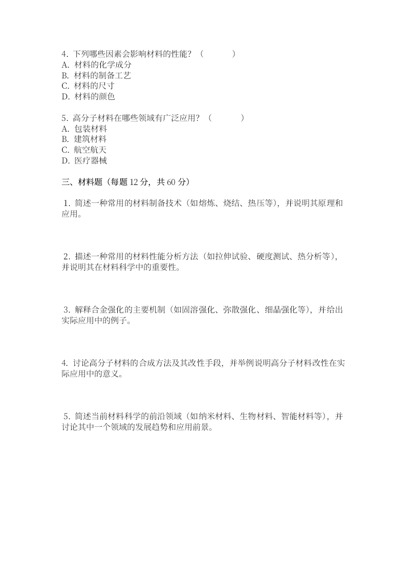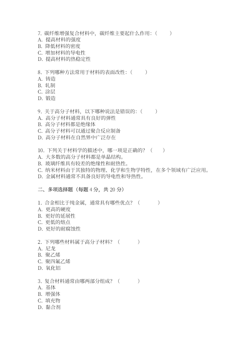 广州中医药大学2023一2024学年第一学期《材料学》期末考试试卷姓名:学院:班级:学号:一、单项选择题(每题2分,共20分)1.材料科学主要研究的是:(A.材料的来源B.材料的结构与性能C.材料的艺术价值D.材料的颜色2.下列哪种材料属于金属材料:()A.陶瓷B.塑料C.钢铁D.橡胶3.关于晶体材料,以下说法正确的是:()A.晶体具有各向同性B.晶体在熔融状态下具有固定的熔点C.晶体都是透明的D.晶体中的原子排列是无序的4.下列哪种材料属于半导体材料:()A.钻石B.硅C.玻璃D.氧化铝5.塑料属于哪一类材料:()A.金属材料B.无机非金属材料C.高分子材料D.复合材料6.关于合金,以下说法正确的是:(A.合金的熔点通常高于其组成金属B.合金是纯净物C.合金的硬度通常低于其组成金属D.合金具有金属特性
