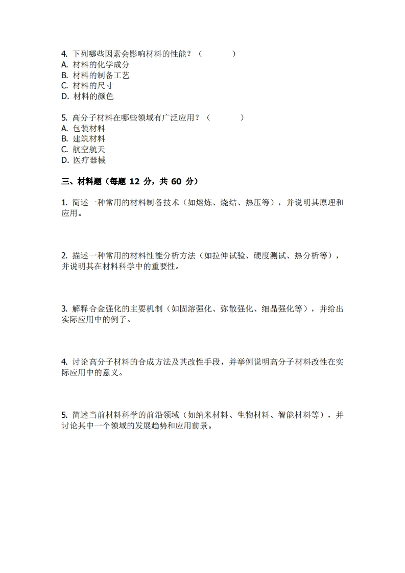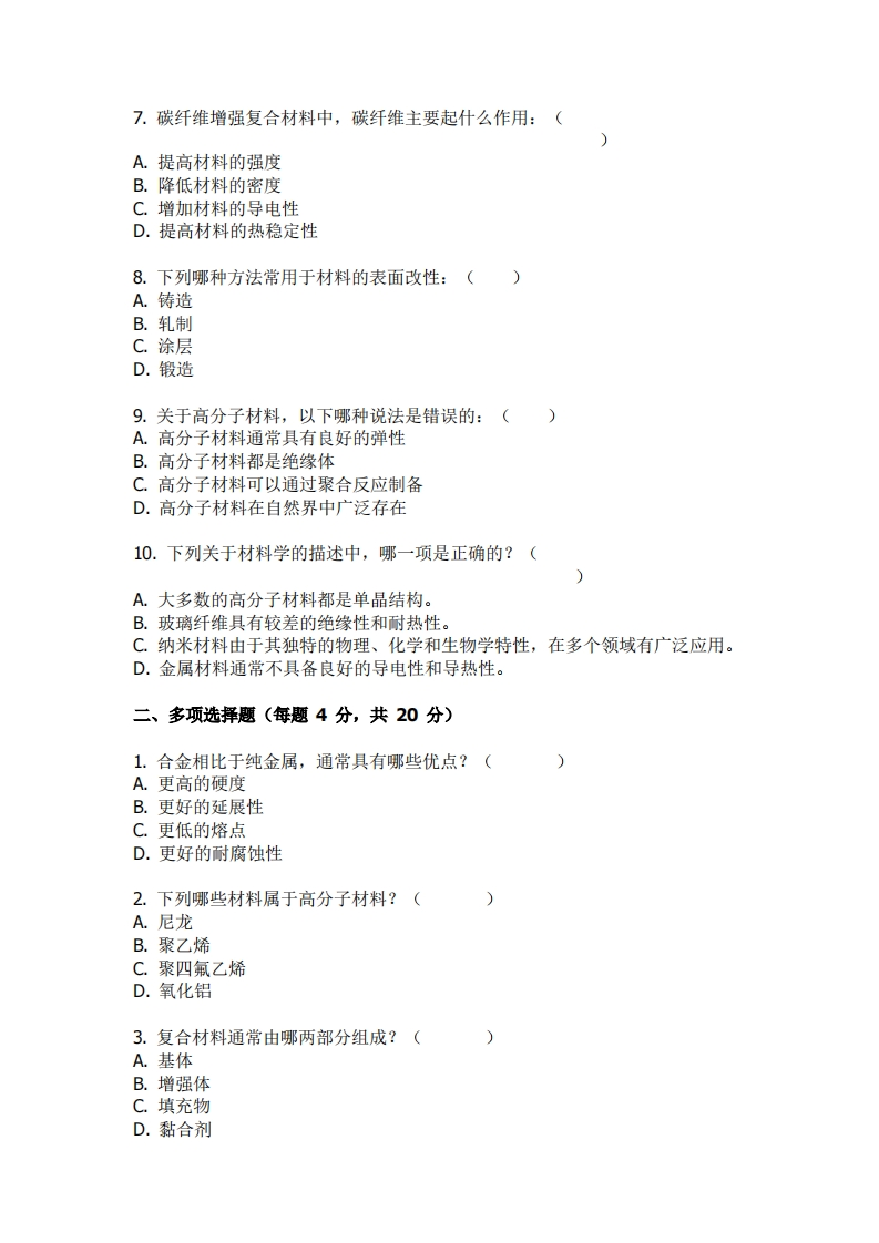 广州中医药大学2023一2024学年第一学期《材料学》期末考试试卷姓名:学院:班级:学号:一、单项选择题(每题2分,共20分)1.材料科学主要研究的是:()A.材料的来源B.材料的结构与性能C.材料的艺术价值D.材料的颜色2.下列哪种材料属于金属材料:()A陶瓷B.塑料C.钢铁D.橡胶3.关于晶体材料,以下说法正确的是:()A.晶体具有各向同性B.晶体在熔融状态下具有固定的熔点C.晶体都是透明的D.晶体中的原子排列是无序的4.下列哪种材料属于半导体材料:()A.钻石B.硅C.玻璃D.氧化铝5.塑料属于哪一类材料:()A.金属材料B.无机非金属材料C.高分子材料D.复合材料6.关于合金,以下说法正确的是:()A.合金的熔点通常高于其组成金属B.合金是纯净物C.合金的硬度通常低于其组成金属D.合金具有金属特性