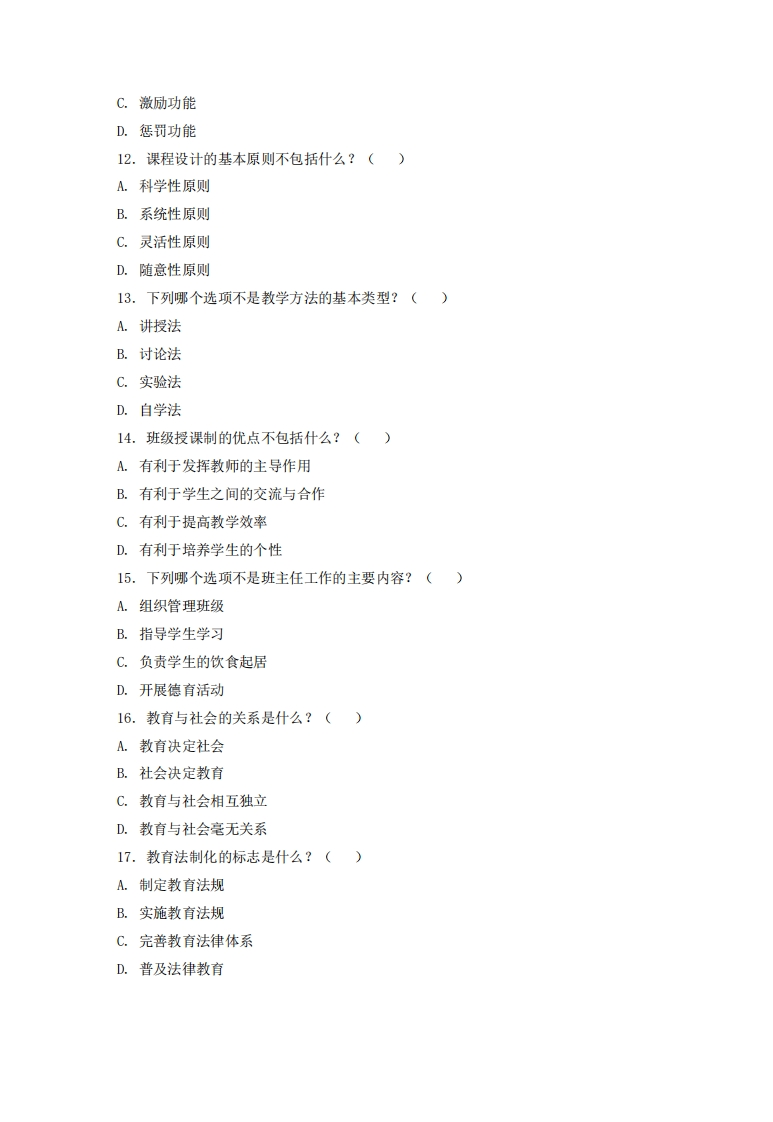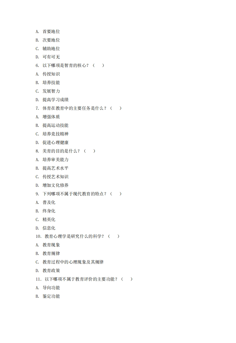 贵州大学2023-2024学年第一学期末考试试卷教育学注意事项:1.请考生在下列横线上填写姓名、学号和年级专业。2,请仔细阅读各种题目的回答要求,在规定的位置填写答案3.不要在试卷上乱写乱画,不要在装订线内填写无关的内容。4.满分100分,考试时间120分钟学一、单项选挥题(每题1分,共20分)1.教育学是研究什么的科学?()A.教育现象与规律B.教学方法与技巧C.学生学习心理D.学校管理制度2.以下哪项不属于教育的功能?()A.培养人才B.传递文化C.促进社会进步D.增加经济负担3.教育的根本目的是什么?()A.传授知识B.培养技能C.促进人的全面发展D.提高考试成绩4.下列哪个选项不是教育的基本要素?()A.教育者B.受教育者C.教育内容D.教育环境5.德育在教育中处于什么地位?()