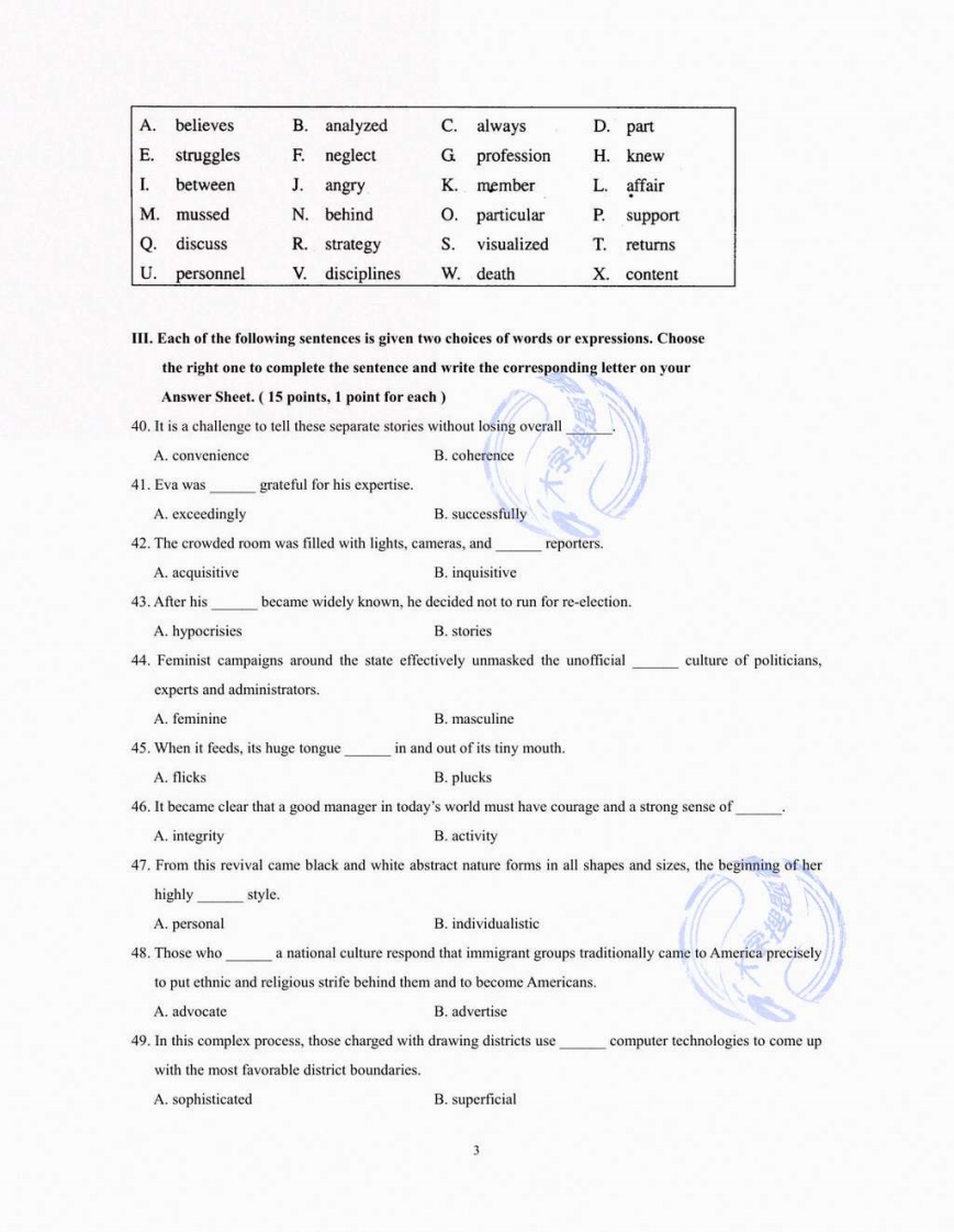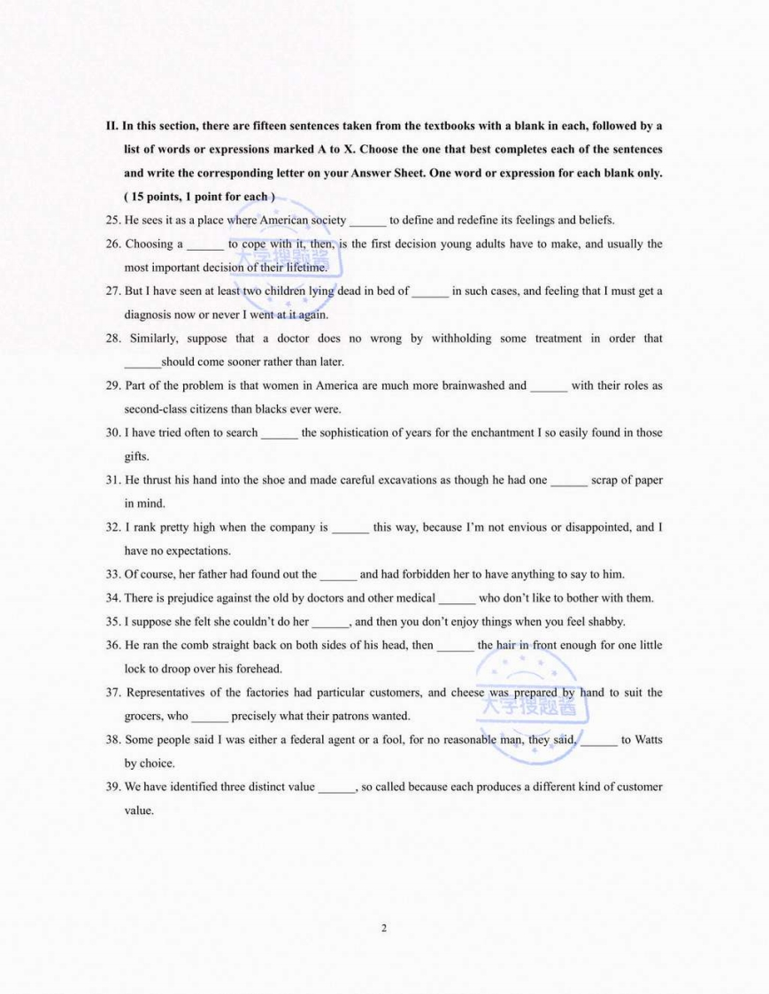 海南大学《大学英语》2021至2022学年第一学期期末姓名学号考试时间:150分钟I.The following paragraphs are taken from the textbooks,followed by a list of words or expressionsmarked A to X.Choose the one that best completes each of the sentences and write the correspondingletter on your Answer Sheet.One word or expression for each blank only.(12 points,0.5 point foreach)Work therefore is desirable,first and foremost,as a1 of boredom,for the boredom that a man feels whenhe is doing necessary though uninteresting work is as nothing in2 with the boredom that he feels when hehas nothing to do with his days.With this advantage of work another is3,namely that it makes holidaysmuch more delicious 4 they come.Provided a man does not have to work so hard as to 5 his vigor,he is likely to find far more zest in his free time 6 an idle man could possibly find.Discussing the question,some time 7,with an old friend,she gave me her never-failing 8 forsleeplessness,which was to imagine9 performing some trivial 10over and over again,until,hermind becoming disgusted with the monotony of life,11 drew the curtain.Her favourite device was toimagine a picture not 12quite plumb upon the wall,and then to proceed to straighten it.I believe that over a period of decades newspapers have become a 13 rather than a function.They haveheld their 14 so long that change has become 15.I do not know,in fact,of any 16 that haschanged as little in the last twenty years as the 17 press.And this resistance to change is the end of18-which,in turn,marks the end of usefulness.The key is to segment the market 19.This enables the company to pitch20customers withspecialized 21 that no other company can begin to 22.Example:One customer segment is the23profession.Cable Wireless is developing features and functions that24 tremendous appeal tolawyers.A.servicesB.inadmissibleCassociatedD.preventiveE.remedyRhangingGhabitH.specificfranchiseprovideK.haveygrowthM.mediumN.when0.comparisonPactionQ.verticallyR.dailyS.legalT.sleepU.herselfV.impairW.agoX.than