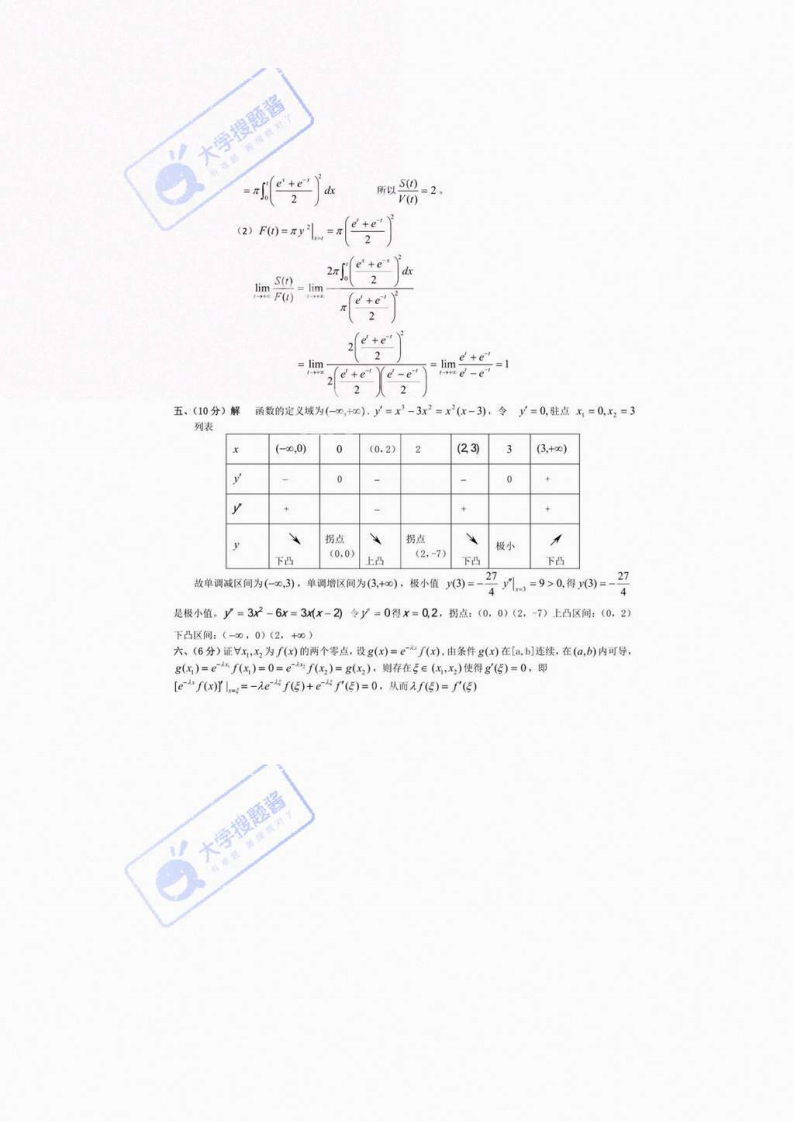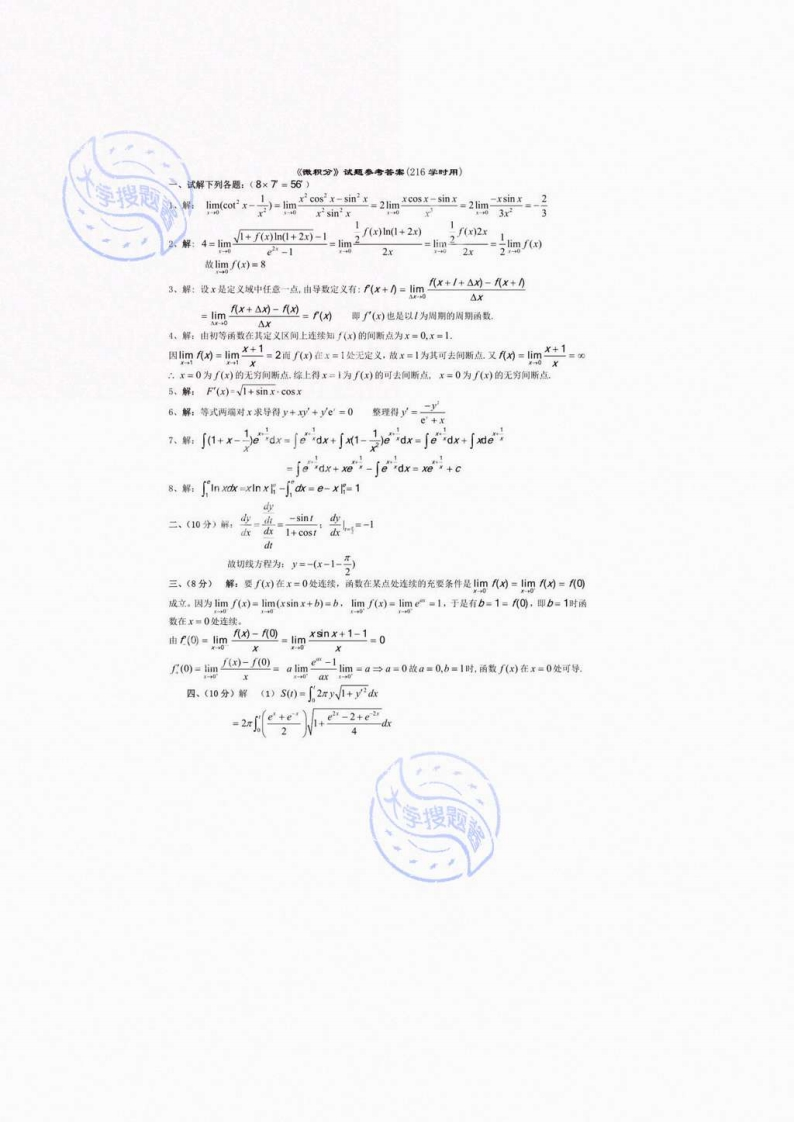 2018一2019第一学期《微积分》期来考试试慧(216学时)试解下列各题:(8×7■56)求极限:四cor-与搜题4,四3,试证:若(x)是可导的周期为/的函数,则f(对电是以!为州刚的脚期函数求函数网)=亡-上的铜断点,并对新其类型(x-1r5.已妇F)-“+,果F国。设y-由方+之:0能,水盘.计算不定积分1+x-edx8,计算定积分nxd放二、(10分》设y=油参数方袋+血确定,求鱼线y=在1一号对应处的切线方y=cost26xsnx+b xs0三、(8分》设橘数对=”X>0a6为解值时,)在x=0处可导.因、(10分)找y=C+与直线x=,x=1(1>0》及y=0国成一曲边梯形,该曲边梯形绕x2轴旋转一周得一囊转体,其体积为V),解面积为S),在x=1处的底面积为F))求识的值:2》计算袋限S(00)F()五,0分》y-的-兰P果1)函数()的单词增加。单调减少区间,极大。极小值:2)曲线y=f(x)的凸性风间,拐点六、(6分)设fx)为可微函数。试证:在任意两个零点之创经有点x使(x)=Af(x),搜题