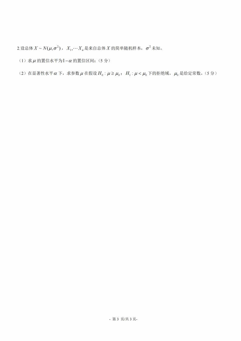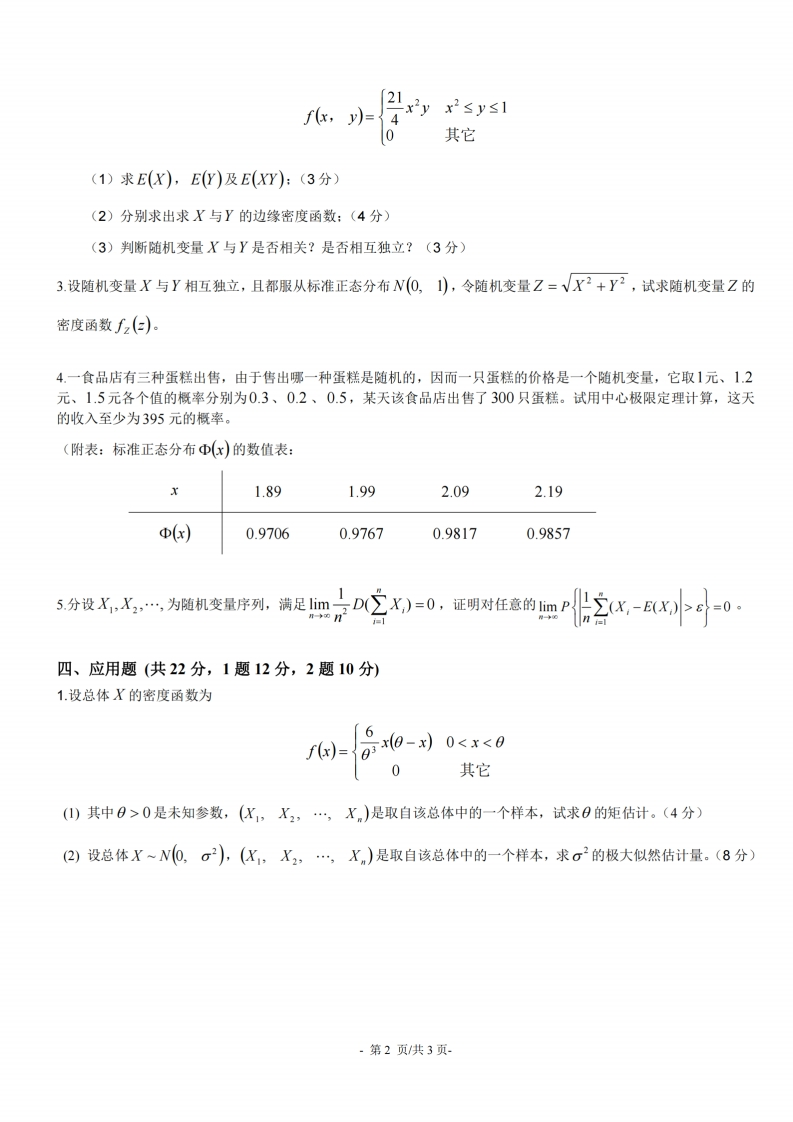 杭州师范大学钱江学院2017-2018学年2017级第一学期《概率论与数理统计》考试试卷班级姓名学号题号三四五六七八九总得分评卷人审核人得分一、填空题(共16分,2,3题3分,其余每空2分)1.将下列事件用A,B,C表示出来。(1)三个事件中至少有一个发生(2)三个事件中至少有两个发生(3)三个事件中恰好发生两个2.设A,B是两个随机事件,P(A)=0.7,P(A-B)=0.3,则P(AB)=3.盒子中有5个球,编号分别为1,2,3,4,5,从中随机取出3个球,令X:取出的3个球中的最大号码。求随机变量X的分布律4.设总体X~N,o),X…X,是来自总体X的简单随机样本,了=之X,则二业5.设总体X~N(4,σ2),(X1,X2,,Xo)为其样本,样本容量为10,则的联合分布密度为二、概率题(共10分)根据以往的考试结果分析,努力学习的学生中有90%的可能考试及格,不努力学习的学生中有90%的可能考试不及格。据调查,学生中有90%的人是努力学习的,试问:(1)考试及格的学生中有多大可能是不努力学习的人?(5分)(2)考试不及格的学生中有多大可能是努力学习的人?(5分)三、证明题(共50分,每题10分)1设连续型随机变量X的密度函数0≤x<1f(x)=2-cx1≤x≤2,0其它求:(1)常数c:(5分)(2)概率P{0.2