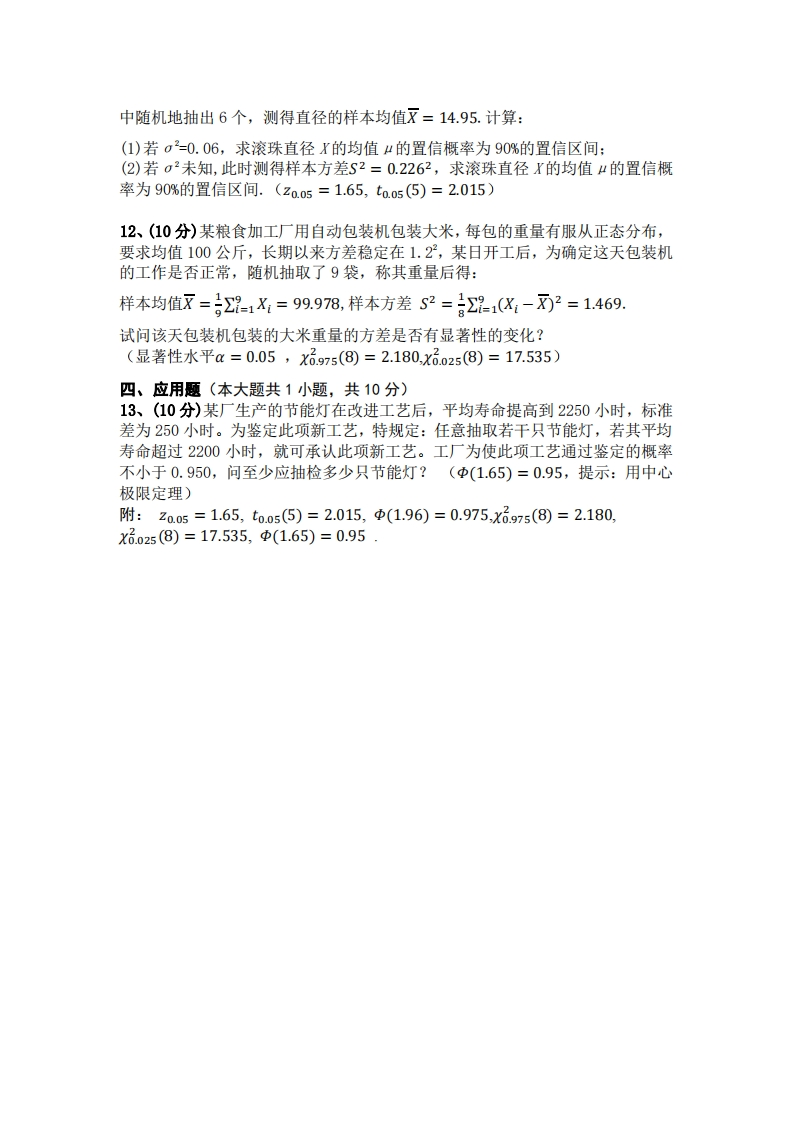 杭州师范大学钱江学院2019一2020学年度第二学期期末考试《概率论与数理统计》一、计算小题(本大题共6小题,每题5分,共30分.要求:写出计算步骤.)1、(5分)设P(A)=0.25,P(B)=0.2,P(4UB)=0.3,求P(AUB)。2、(⑤分)从整数范围400~999中随机地取1个数,求它不能同时被2和5整除的概率。3、(5分)对二维随机变量(X,Y),已知D(X)=4,D(Y)=9,Pxy=0.5,求D(X-2Y).4、(5分)对二维随机变量(X,Y),已知E(X)=1,E(Y)=2,D(X)=1,D(Y)=4,P=-0.5,利用切比雪夫不等式估计P(I2X-Y|≥10)的值。5、(⑤分)设总体的数学期望μ和方差σ都存在,X1,X2,X3为来自总体的一个样本,验证下面的估计量为“的无偏估计,并指出哪一个估计有效。四=X+品X2+X,应=X1+x2+是X6、(5分)设X~N(0,1),X1,X2,X3,X4,X5,X是来自总体X的容量为6的样本,当统计量一c-3)服从t分布,确定系数c和t分布的自由度。√X号+X+x经+X经二、计算题(本大题共3小题,每题10分,共30分)7、(10分)设甲、乙、丙3个班参加《概率论》考试,各班人数依次占考试总人数的45%,30%,25%。各班试卷成绩及格率依次是60%,75%,50%,将所有试卷混放在一起,(1)从中任取一张试卷,求该试卷成绩及格的概率:(2)若任取一张试卷成绩是及格的,则它来自甲班的概率。8、(10分)设随机变量X服从拉普拉斯分布,其密度函数为:f(x)=Ae-lx,-o0,y>0f(x,y)=0其他试求:(1)系数(2)边缘概率密度fx(x),fy),并判断X与Y是否独立:(3)求Z=X/Y的密度函数。三、统计题(本大题共3小题,每题10分,共30分)10、(10分)设某种药品针对某种疾病的治愈率为p。现从患者中随机抽出15人服用此药,发现其中有5人治愈.试求:(1)治愈率p的矩估计值1:(2)治愈率p的最大似然估计值p2:11、(10分)某车间生产滚珠,已知其直径X~N(4,σ2),现从某一天生产的产品