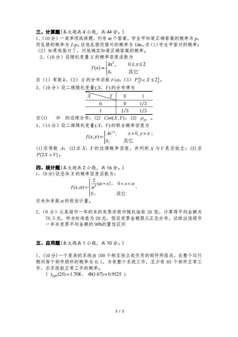 杭州师范大学钱江学院《概率论与数理统计》2020-2021学年期末试卷猴哥6个月前更新关注私信0.41MB2页08433杭州师范大学钱江学院《概率论与数理统计》2020-2021学年期末试卷此内容为付费资源,请付费后查看10积分年度会员免费月享会员免费登录购买付费资源已售 105 第1页 / 共2页 第2页 / 共2页 已完成全部阅读,共2页 © 版权声明文章版权归作者所有,未经允许请勿转载。THE END《杭州师范大学》期中期末历年真题《杭州师范大学钱江学院》期中期末历年真题期末试卷 文本预览 杭州师范大学钱江学院2020一2021学年度第一学期期末考试《概率论与数理统计》一、填空题(本大题共8小题,10个空,每空2分,共20分)1、若事件A,B互斥,且P(A)=0.4,P(B)=0.3,则P(AB)=2、甲、乙、丙三人等可能地被分到四个房间中的任一间内,则三个人分在同一间的概率为3、若随机变量X~U(α,b),则X的概率密度函数为4、若随机变量X~N(2,σ2),且P{2 查看更多 收起部分 喜欢就支持一下吧点赞33赞赏 分享QQ空间微博QQ好友海报分享复制链接收藏 猴哥关注 04.7W+0281270W+ 分享各类学习考试资料,欢迎关注我。 北京理工大学-睿信书院-《复变函数与积分变换》2018-2019学年期末试卷B卷北京理工大学-睿信书院-《复变函数与积分变换》2018-2019学年期末试...6个月前 2.3W+北京理工大学《计算机基础》2018-2019学年期末试卷北京理工大学《计算机基础》2018-2019学年期末试卷6个月前 2.3W+北京理工大学《高等数学》2019-2020学年期末试卷北京理工大学《高等数学》2019-2020学年期末试卷6个月前 2.3W+北京理工大学数据结构期末试卷北京理工大学数据结构期末试卷6个月前 2.3W+北京理工大学《计算机基础》2017-2018学年期末试卷北京理工大学《计算机基础》2017-2018学年期末试卷6个月前 2.3W+北京理工大学-睿信书院-《复变函数与积分变换》2016-2017学年期末试卷A卷北京理工大学-睿信书院-《复变函数与积分变换》2016-2017学年期末试...6个月前 2.3W+ 上一篇 杭州师范大学钱江学院《概率论与数理统计》2019-2020学年期末试卷 下一篇 杭州师范大学钱江学院《概率论与数理统计》2021-2022学年期末试卷 相关推荐 北京理工大学-睿信书院-《复变函数与积分变换》2018-2019学年期末试卷B卷北京理工大学-睿信书院-《复变函数与积分变换》2018-2019学年期末试卷B卷6个月前 2.3W+北京理工大学《计算机基础》2018-2019学年期末试卷北京理工大学《计算机基础》2018-2019学年期末试卷6个月前 2.3W+北京理工大学《高等数学》2019-2020学年期末试卷北京理工大学《高等数学》2019-2020学年期末试卷6个月前 2.3W+北京理工大学数据结构期末试卷北京理工大学数据结构期末试卷6个月前 2.3W+北京理工大学《计算机基础》2017-2018学年期末试卷北京理工大学《计算机基础》2017-2018学年期末试卷6个月前 2.3W+北京理工大学-睿信书院-《复变函数与积分变换》2016-2017学年期末试卷A卷北京理工大学-睿信书院-《复变函数与积分变换》2016-2017学年期末试卷A卷6个月前 2.3W+ 评论 抢沙发 请登录后发表评论 登录 注册 暂无评论内容