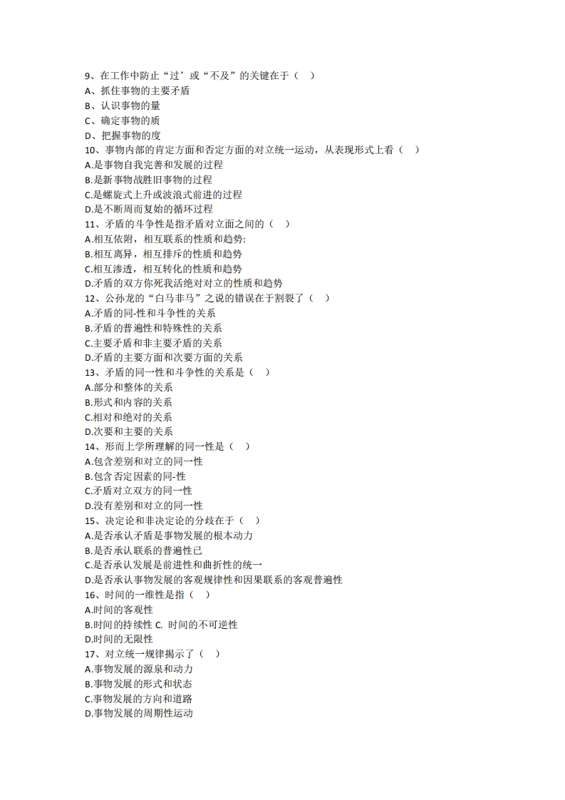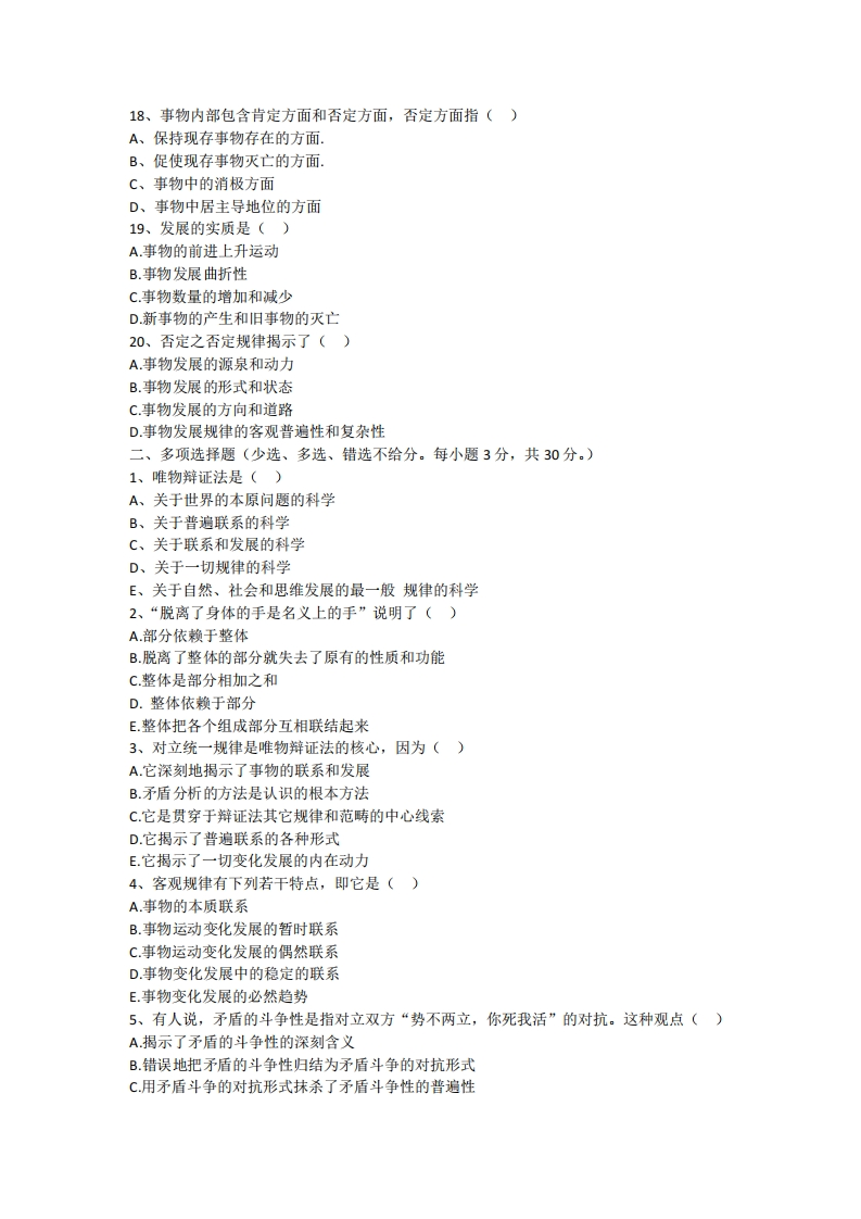 杭州师范大学钱江学院2020-2021学年第一学期期末测试马克思主义基本原理一、单选题(在本题的每一小题的备选答案中,只有一个答案是正确的,请把你认为正确的答案填入附表一。多选不给分。每题1分,共20分)。1、唯物辩证法和形而上学的根本对立的焦点在于是否承认()A.事物的普遍联系B.事物的运动、变化和发展C.事物发展的动力是内部矛盾D经过量变过渡到质变2、系统论科学的出现()A.否定了辩证法B.扬弃了辩证法C.代替了辩证法D.丰富了辩证法3、唯物辩证法的实质和核心是()A.质量互变规律B.对立统一规律C.世界普遍联系规律D.否定之否定规律.4、唯物辩证法认为,发展的实质是()A、事物数量的增加和减少B、事物的简单重复和循环C、新事物的产生和旧事物的灭亡D.物体的位置移动或场所的变更5、唯物辩证法的总特征是()A.唯物辩证法的范畴和体系B.联系和发展的观点C运动和静止辩证统一的观点D.矛盾着的对立面又统一又斗争6、矛盾的两个根本属性是指(A.矛盾范畴内容的客观性与形式的主观性B、矛盾的普遍性与矛盾的特殊性C、矛盾的同一性和矛盾斗争性D、矛盾发展不平衡性与矛盾解决形式的多样性7、构成人们认识事物的基础是指()A.矛盾的同一性B.矛盾的斗争性C.矛盾的普遍性D.矛盾的特殊性8、辩证唯物主义认为事物发展的规律是()A.思维对事物本质的概括和反映B.用来整理感性材料的思维形式C.事物内在的本质的稳固的联系D.事物联系和发展的基本环节