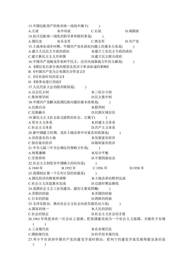 杭州师范大学钱江学院《毛泽东思想和中国特色社会主义理论体系概论》2021-2022学年第二学期期末试卷一、单项选择题(在每小题的四个备选答案中,选出一个正确答案,并将正确答案的序号填在题干的括号内。每小题1分,共30分)1.第一次提出“毛泽东思想”概念的是(A.张闻天B.王稼祥C.朱德D.刘少奇2.毛泽东《反对本本主义》一文所反对的主要错误倾向是(A.自由主义B经验主义C.教条主义D.官僚主义3.中国革命和建设的基本立足点是(A独立自主、自立更生B解放思想、实事求是C.自力更生为主,争取外援为辅D对内改革,对外开放4.就毛泽东一生来看,他的功绩和过失的比重是(A过大于功B功大于过C.功过参半D.有功无过5.中国旧民主主义革命转变为新民主主义革命的标志是(A.戊戌变法运动B.新文化运动C.五四运动D.国民革命运动6.新民主主义国家的政体是(A.议会制B.委员会制C.人民代表大会制D.政治协商制7.新民主主义经济的领导成分是(A.个体经济B.合作社经济C.国家资本主义D.国营经济8.中国共产党创建初期,主要精力是放在(A.发展党的组织B.发动工人运动C.解决土地问题D.开展军事斗争9.毛泽东批评“城市中心论”、提出“以乡村为中心”思想的文章是(A.《中国的红色政权为什么能够存在?》B.《井冈山的斗争》C.《星星之火,可以燎原》D.《反对本本主义》10.毛泽东人民战争战略战术思想的核心是(A.积极防御的思想B.集中兵力打歼灭战的思想C.战略进攻和战略决战的思想D.战略上藐视敌人,战术上重视敌人的思想11.决定共产党员以个人身份加入国民党的会议是(A.中共一大B.中共二大C.中共三大D.中共四大12.中国革命统一战线的基础是(A坚持无产阶级领导权B.制定正确的政治纲领C,建立巩固的工农联盟D实行符合实际的政策和策略