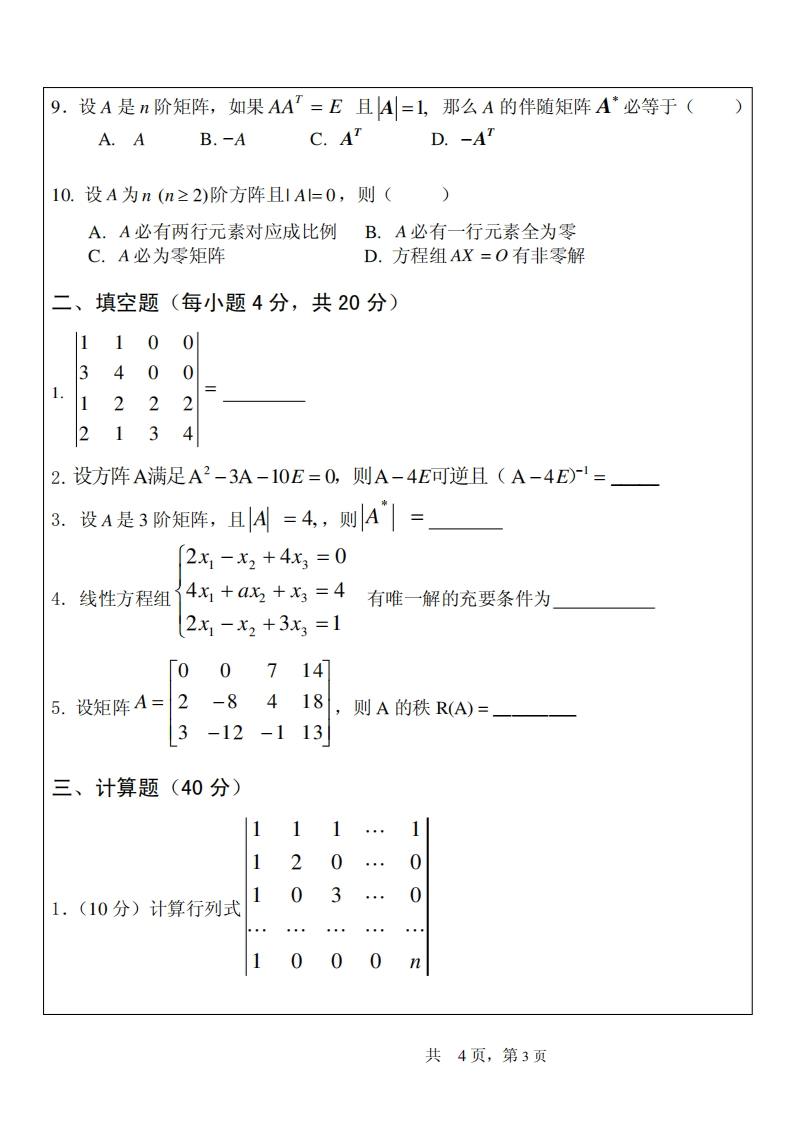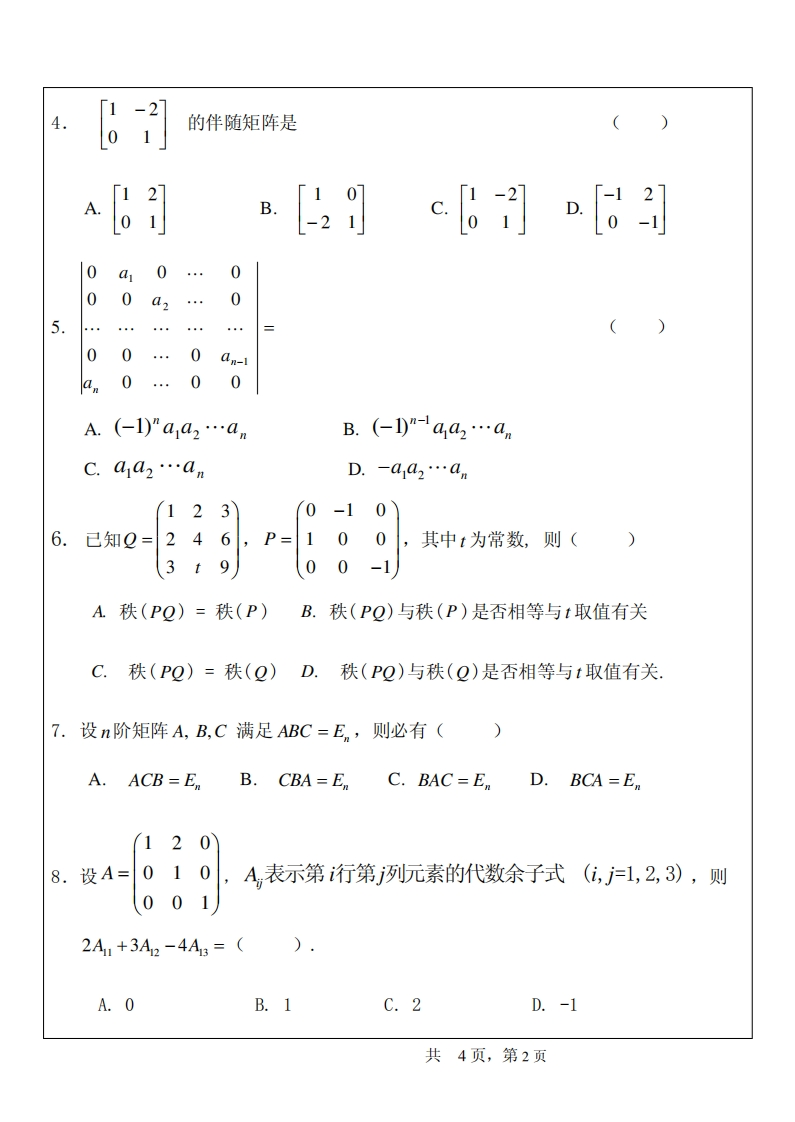 杭州师范大学钱江学院2020一2021学年第一学期期中统考试卷专业:年级:课程名称:线性代数任课教师:所试卷类别:开卷()闭卷(√)考试用时:120分钟在考试时间:2020年11月21日上午9点0分系题号三.1三.2三.3三.4四总分得分超单项选择题(每小题3分,共30分)1.设A,B是n阶方阵,则必有(名准A.(AB)2=A2B2B.AF3姓C.(A-B)2=A2-2AB+B2D.ABF BA不2.设A是2×3矩阵,将A的第一行的2倍加到第二行,从而化为矩阵B,则有()10020A.AP=B,其中P=21AB其中B.学10号生C.PA=B,其中P10D.0013.线性方程组Ax=b有唯一解的条件是考A.R(A)=R(A,b)=A的列数B.R(A)=R(A,b)C.R(A)=R(A,b)=A的行数D.R(A)