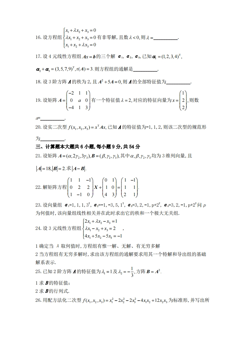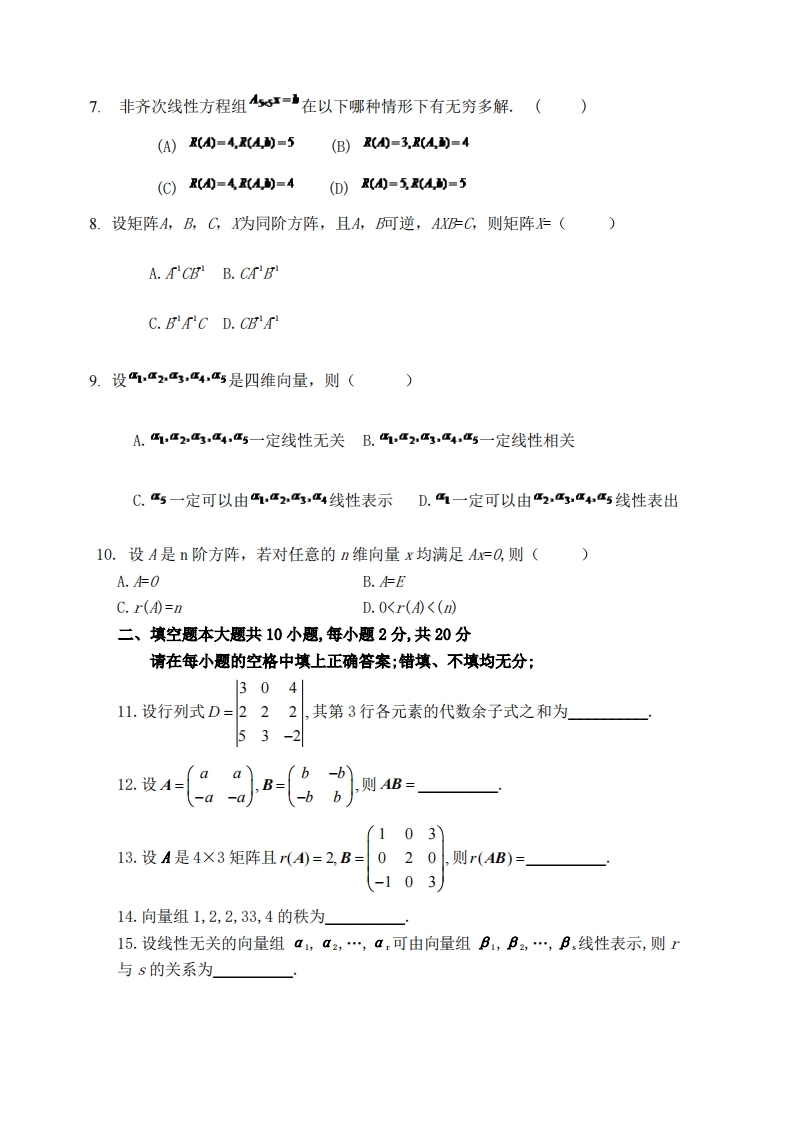 杭州师范大学钱江学院《线性代数》2022-2023学年期末考试试卷(2)猴哥6个月前更新关注私信0.23MB4页08658杭州师范大学钱江学院《线性代数》2022-2023学年期末考试试卷(2)此内容为付费资源,请付费后查看10积分年度会员免费月享会员免费登录购买付费资源已售 105 第1页 / 共4页 第2页 / 共4页 第3页 / 共4页 试读已结束,还剩1页,您可下载完整版后进行离线阅读 © 版权声明文章版权归作者所有,未经允许请勿转载。THE END《杭州师范大学》期中期末历年真题《杭州师范大学钱江学院》期中期末历年真题期末试卷 文本预览 杭州师范大学钱江学院2022-2023第一学期线性代数(A)卷一、单项选择题本大题共10小题,每小题2分,共20分在每小题列出的四个备选项中只有一个是符合题目要求的,请将其代码填写在题后的括号内;错选、多选或未选均无分:1.设A为mxn矩阵,则有()。A.若m 查看更多 收起部分 喜欢就支持一下吧点赞58赞赏 分享QQ空间微博QQ好友海报分享复制链接收藏 猴哥关注 04.7W+0281261W+ 北京理工大学-睿信书院-《复变函数与积分变换》2018-2019学年期末试卷B卷北京理工大学-睿信书院-《复变函数与积分变换》2018-2019学年期末试...6个月前 2.3W+北京理工大学《计算机基础》2018-2019学年期末试卷北京理工大学《计算机基础》2018-2019学年期末试卷6个月前 2.3W+北京理工大学《高等数学》2019-2020学年期末试卷北京理工大学《高等数学》2019-2020学年期末试卷6个月前 2.3W+北京理工大学数据结构期末试卷北京理工大学数据结构期末试卷6个月前 2.3W+北京理工大学《计算机基础》2017-2018学年期末试卷北京理工大学《计算机基础》2017-2018学年期末试卷6个月前 2.3W+北京理工大学-睿信书院-《复变函数与积分变换》2016-2017学年期末试卷A卷北京理工大学-睿信书院-《复变函数与积分变换》2016-2017学年期末试...6个月前 2.3W+ 上一篇 杭州师范大学钱江学院《线性代数》2022-2023学年期末考试试卷(1) 下一篇 杭州师范大学钱江学院《线性代数》2022-2023学年期末考试试卷(3) 相关推荐 北京理工大学-睿信书院-《复变函数与积分变换》2018-2019学年期末试卷B卷北京理工大学-睿信书院-《复变函数与积分变换》2018-2019学年期末试卷B卷6个月前 2.3W+北京理工大学《计算机基础》2018-2019学年期末试卷北京理工大学《计算机基础》2018-2019学年期末试卷6个月前 2.3W+北京理工大学《高等数学》2019-2020学年期末试卷北京理工大学《高等数学》2019-2020学年期末试卷6个月前 2.3W+北京理工大学数据结构期末试卷北京理工大学数据结构期末试卷6个月前 2.3W+北京理工大学《计算机基础》2017-2018学年期末试卷北京理工大学《计算机基础》2017-2018学年期末试卷6个月前 2.3W+北京理工大学-睿信书院-《复变函数与积分变换》2016-2017学年期末试卷A卷北京理工大学-睿信书院-《复变函数与积分变换》2016-2017学年期末试卷A卷6个月前 2.3W+ 评论 抢沙发 请登录后发表评论 登录 注册 暂无评论内容