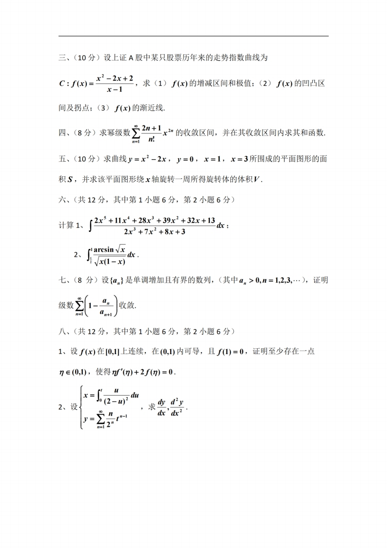 合肥工业大学考试试卷2022~2023学年一学期高等数学课程时间110分钟72学时,4学分,闭卷,总分100分,占总评成绩70%22年12月日一、填空题(本题24分,每小题3分)1、设imVa+12Y-x-sin x=1,则a=2、设y=sinf(x2),其中函数f()是可微的,则=_3、设函数f(x)=xarctan文t≠0,则时的间断点为2,x=0间断点的类型为4、设f'(sin2x)=cos2x,则,f(x)=5nw6、星形线x=acos3,y=asin3t的全长为不、已知e=元,则广义积分∫e=8、设fx)=1-0≤x≤x)的余弦级数的和函数为S(x),则S(-3)=_元二、(共16分,其中第1小题8分,第2小题8分)1、求极限im(,”,+”`n+©n2+1n2+2n2+n1x4cose*-1x<02、设函数f(x)={a,x=0在(-0,+o)内连续,求4,b.ln(1+3x)+b,x>0