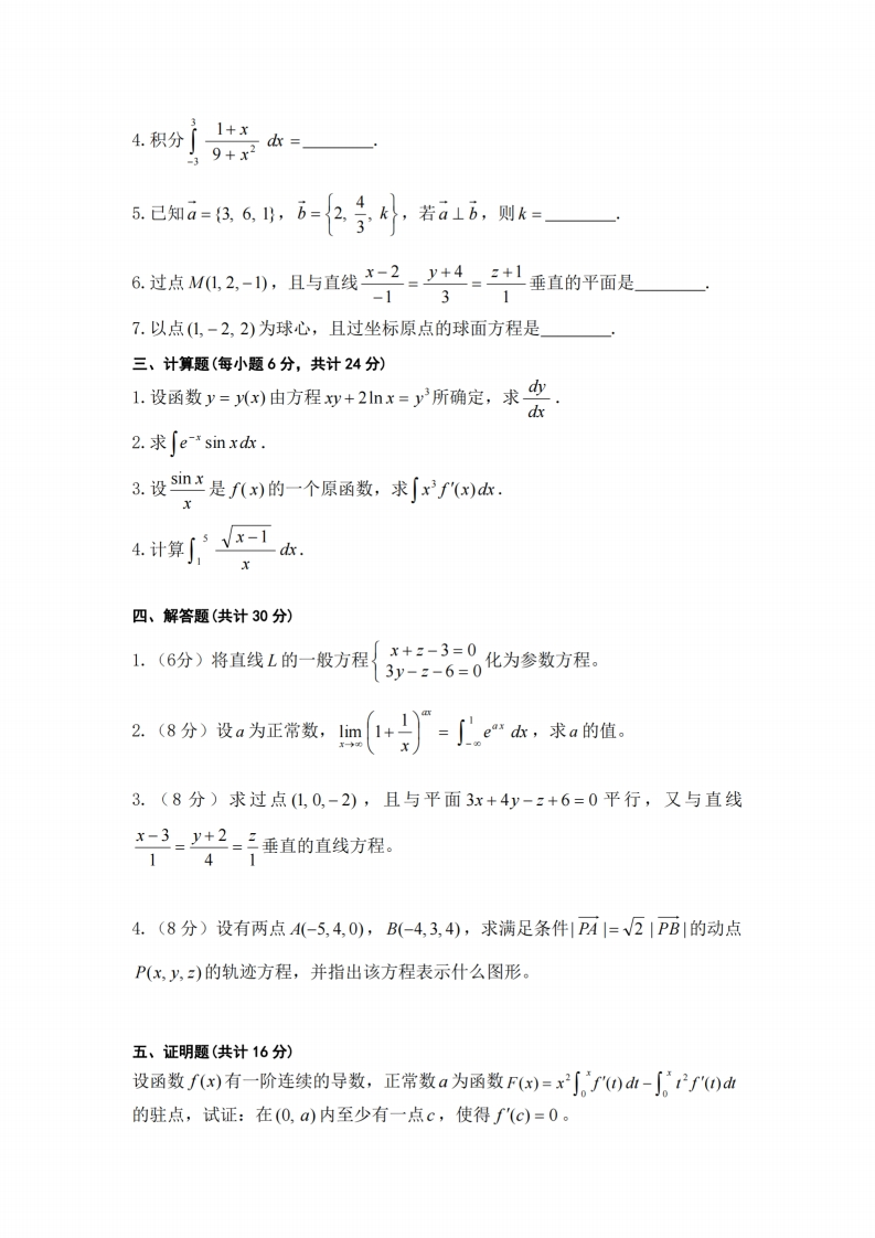 河北工业大学期末考试试卷2022-2023学年第一学期课程名称:高等数学适用专业:数学与应用数学考核方式:闭卷学院名称:理学院班级:姓名:学号:题号二三四五六总分分数阅卷人一、选择题(每小题3分,共计9分)1.设函数f()在[a,b]上连续,F'(x)=f(x),则结论()正确。A.f(x)是F(x)在[a,b]上的一个原函数:R=Fa:C.F(x)是f(x)在[a,b]上唯一的原函数:D.∫F'(x)dk=F(x).2.以下结论中,错误的是()A.积分∫(cos)ydk=cos+C;B积分了-子"背-m7aos1:C.(a+b).(a-B)=lap-BP:D.(a+B)x(a-B)=la2-1812.3.已知直线3x-y+2z-6=0过点(0,0,3),则k的值是()x+4y-z+k=0A.2:B.3;C.4:D.1.二、填空题(每小题3分,共计21分)ji(e-D)dt1网2.设∫f(xk=xe+c,则f'(x)=3.设函数fx)=∫e‘d,x∈(-o,+o),则曲线y=f(x)在(L,0)点的切线方程是