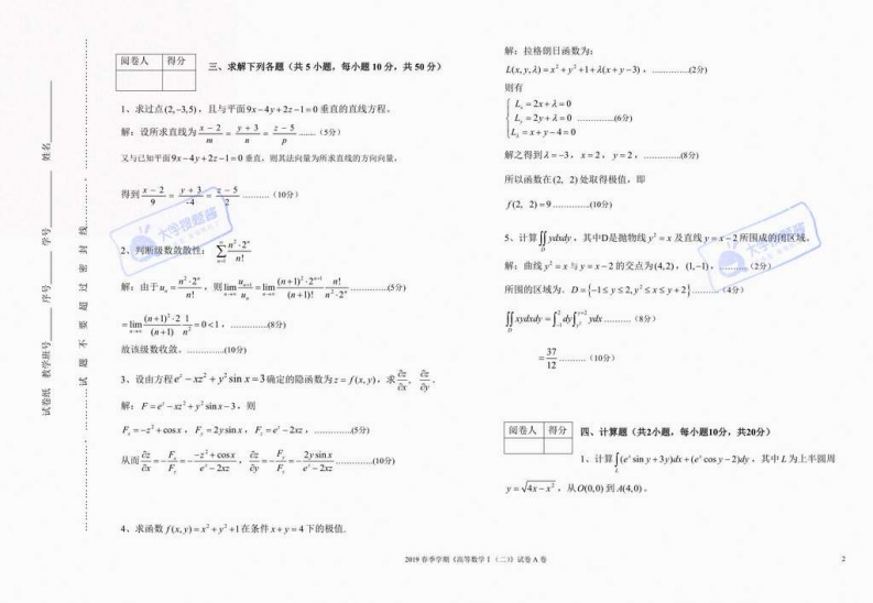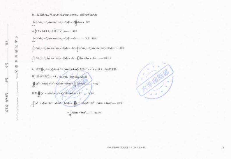 河北工业大学2019年春季学期《高等数学I(二)》期末考试试卷(A卷)及参考答案注意:1、本试卷共)真:2,考试时间110分钟5,姓名,学号必领可在指定推方阅卷负青人签名:阅卷人得分题号最分二、单项选择题(每小题2分,共10分)得分驾1、函数:=x2y2+3的极值点为(A)卷人得分搜题酱烈A.0,0B.0,)c.L0D.不存在就对冠一、镇空题(每空2分,共20分》1、设a=1,23),6=-1.-35)则a-6-8一2级数之收敛是回,=0的《用)形男敬长A。充分必要条件B.充分条件C.必要条件D。非充分非必要条件2、幂级数了二的收敛半径为上·其收敛区侧为山山盟二m+13.L是圆域D:x+s-2x的正向圆周,则fx'-+x-y小女=(C)头已知/一可+在点沿点4到点a的方向号数音为3A.0B.-2xC.2#D.4、求曲面:■x2y在1.1,2)处的切平面方程2x+y-:-2=04、下列级数条件收效的是(A)和法线方程1.-l.22.交换d小f.y)dx-fdxf)dy6、x+y体一反二,其中L为连接,0)和(0,1)两点的直线段5,曲面H=F(x,八,)的一个法响量为(C)7、函数:=x+y一的定义域为In(2-x-0h0s<2A.(FFF-1B.(F-LF:-LF-1C.(F.F.FYD.【-F-F18,lim-8V4+灯-2大李搜题传存华学期(高等数学1二》试号A卷1