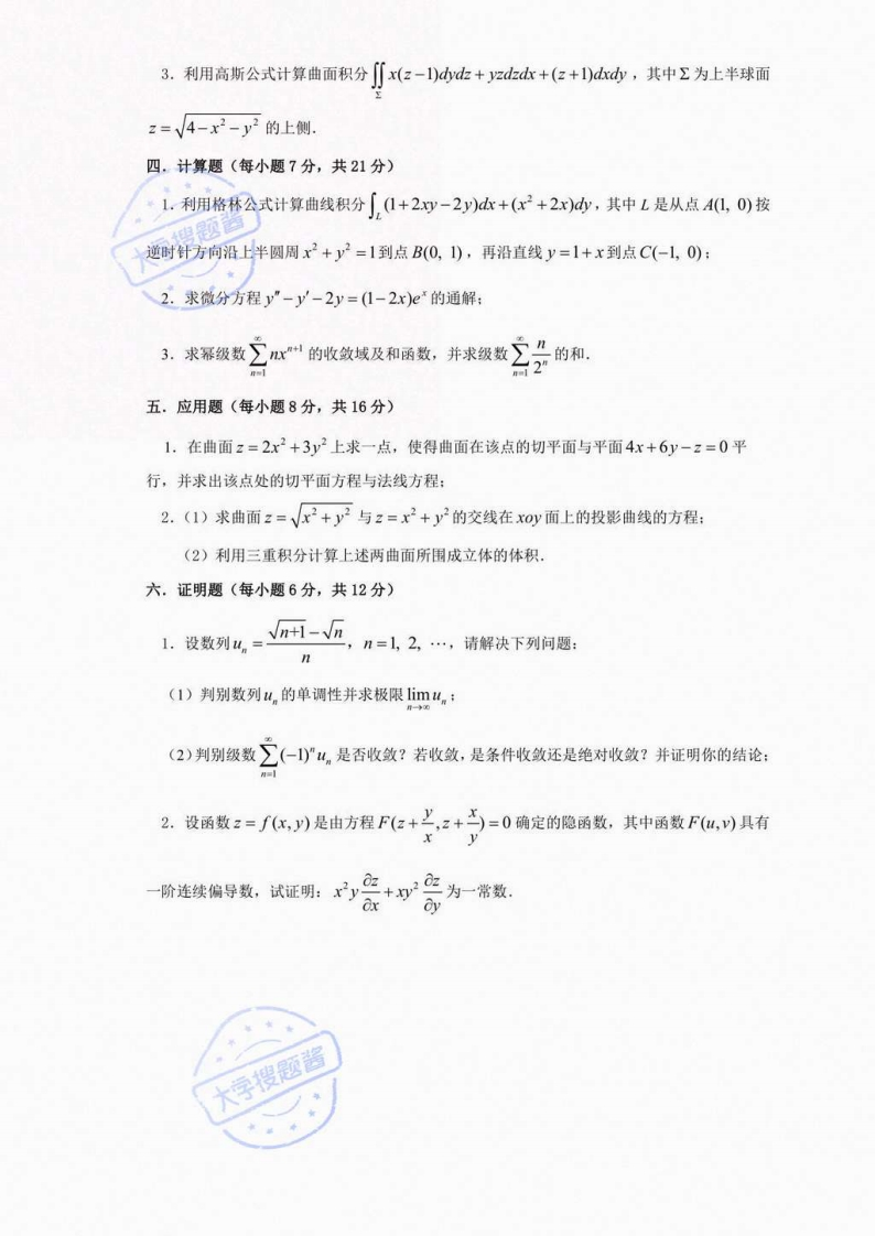 河南师范大学期末课程试卷《高等数学A1》2020-2021第二学期一.填空题(每小题3分,共15分)1.设向量a=(1,1,2),万=(1,2,1),则a×b2.设函数u=ln(x2+y2+z2),则其全微分d=3.改换二次积分。∫f化,y)少的积分次序可得4.设曲线L为圆周x2+y2=1,则曲线积分∫(x2+y2+1)d=一5.将函数f(x)=X2n1+x)展开成x的幂级数为二.选择题(每小题3分,共15分)1.一阶线性方程y-上=xe的通解为A)y=x(e*+C)B)y=x(e*+C)C)y=x2(e *+C)D)y=x2(e*+C)2.函数z=2x2-2y+y2+3在驻点(0,0)处A)取极大值3B)取极小值3C)不取极值D)以上结论都不对3.已知曲线积分「(x2+2y)d+(x)+y2)d与路径无关,则p(x)满足A)(x)=x+CB)(x)=x+CC)(x)=x+CD)(x)=x24.函数u=x2yz在点(1,1,1)处的梯度和在点(1,1,1)处沿着方向1=(1,2,2)的方向导数分别为A)1,2,1)和2B)L,1,2)和1C)(2,1,1)和1D)(2,1,1)和21-x,-π≤x<05.设f(x)为周期是2π的函数,它在区间[-π,π)上定义为f(x)学搜x+3,0≤x<π,则f(x)的傅里叶级数在x=2π处收敛于A)2B)2+πC)2-πD)-2三.计算题(每小题7分,共21分)Oz1.设函数z=f(xy,2x-2y),且∫具有二阶连续偏导数,求。一和Ox axoy2.计算二重积分∬n2xdd,其中D是由直线y=1及抛物线y=x2所围成的平面区域: