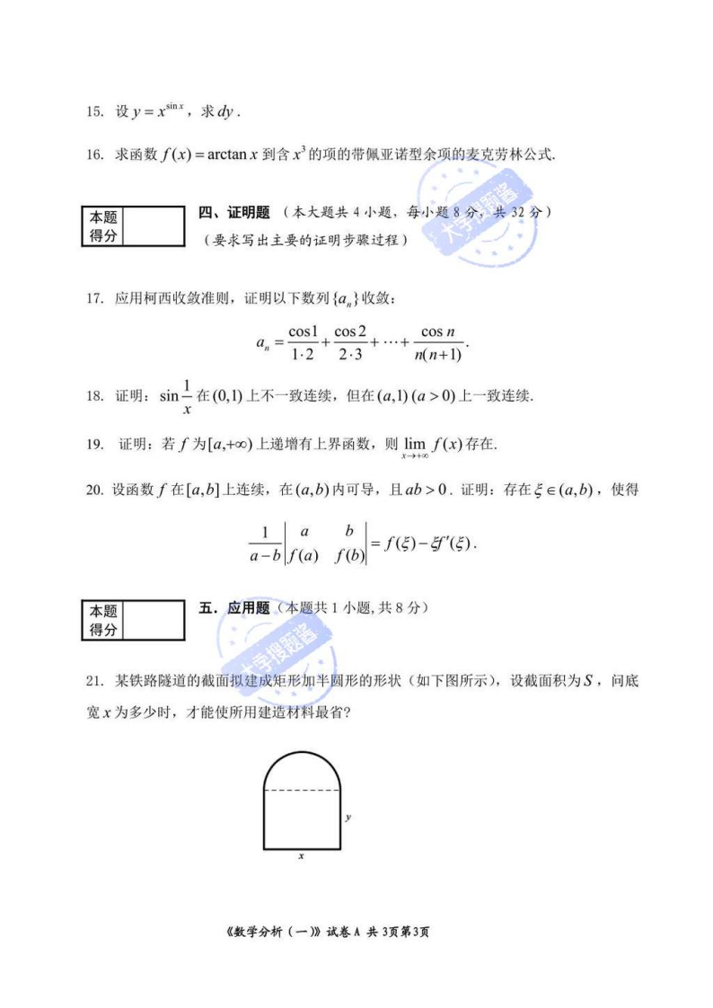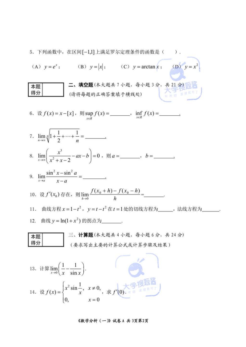 卷号:(A)(2020年11月)机密湖北师范大学期末考试试卷数学分析(一)考试范围第1-6章命题人赵大方院系数学与统计学院考试形式闭卷课程类别必修学期20202专业数学大题号一=三四五班级满分152124328学号也新地得分姓名2阅卷人总分本题一、选择题(本大题共5小题,每小题3分,共15分)得分(从下列四个备选答案A、B、C、D中选择一个正确的答案)1.下列关于狄利克雷函数的表述正确的是().(A)有最小正周期:(B)单调函数:(C)有界函数:(D)R上连续函数,2.设定义域为R,则下列函数中,存在反函数的是().(A)y=:(B)y=e+2;(C)y=vsinx;(D)y=sgnx.3.下列式子中正确的是(),sin-(A)limxsin=1;(B)lim-in2x=2:(c)limxsin=0:(D)lim=1.-0x-0x→X4.下列结论不正确的是().(A)2x3+x2=O(x3)(x→0):(B)x=0是sinx的跳跃间断点:(C)任何有界数列必有收敛子列:(D)若{ak}和{a2k}都收敛,则{an}收敛大学搜题酱《数学分析(一)》试卷A共3页第1页