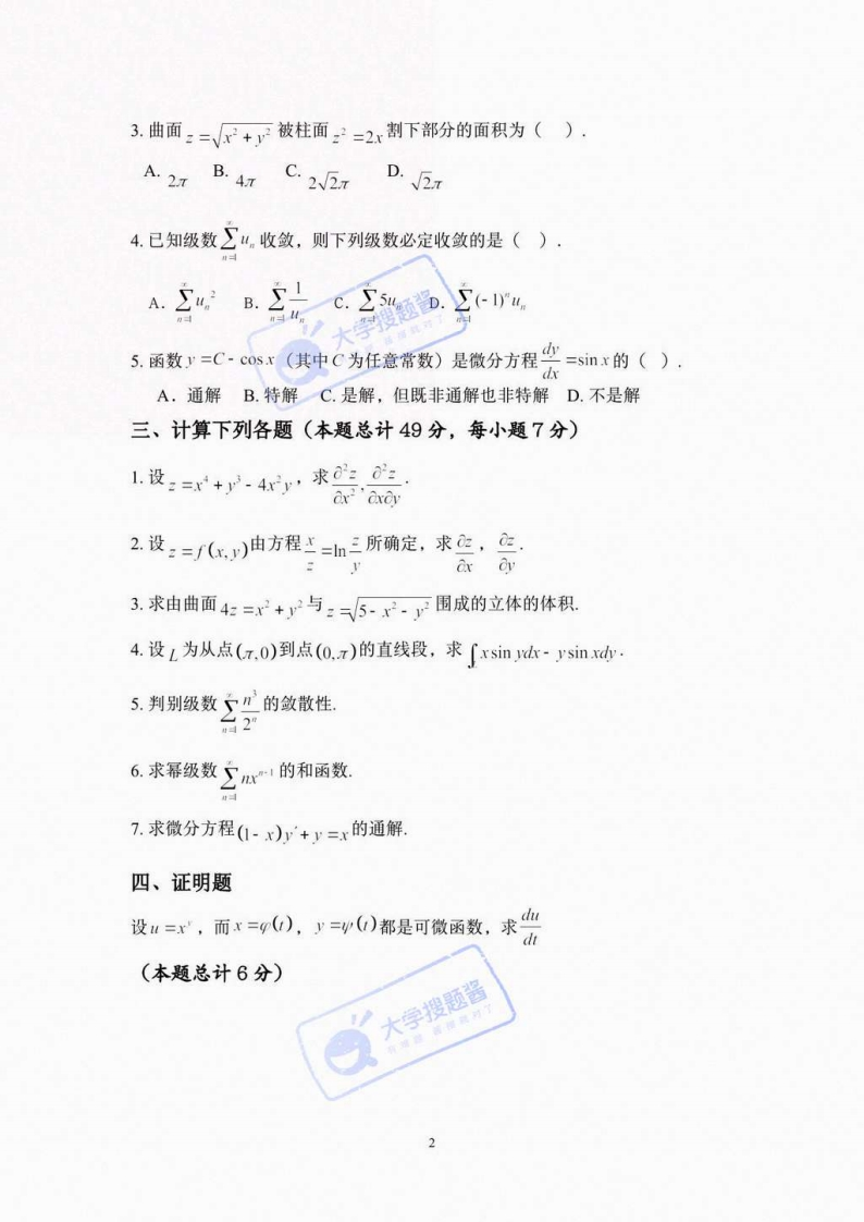 湖南工商大学《高等数学》2021-2022学年第二学期期末试卷说明:所有答案请答在规定的答题纸或答题卡上,答在本试卷册上的无效。一、填空题(本题总计30分,每小空3分)1.设+2202=0则21.12.:-0+)则应3.设,=x,则+y Cr Inx cy1.24.化积分为极坐标形式,则了(+y5.设2:0≤r≤a.0≤y≤h.,0≤:≤c,则9zw=6.曲线x=acos1,y=asin1,2=b1在相应于1=的点处的切线方程为7.设c是以O0.0.40,0,B0.1)为顶点的三角形边界,则dx+y=8如果级数了4收敛,则级数了1为(收敛、发散)9.d山y-2xdk=0阶微分方程.二、单项选择题(本题总计15分,每小题3分)1:=f(x,y)在P(x,)各一阶偏导数存在是该函数在此点可微分的()条件A.必要B.充分C.充要D.无关2.已知单位向量a.b,c满足a+h+c=0,则,b+bc+ca=().A.·为B1C.1D.为