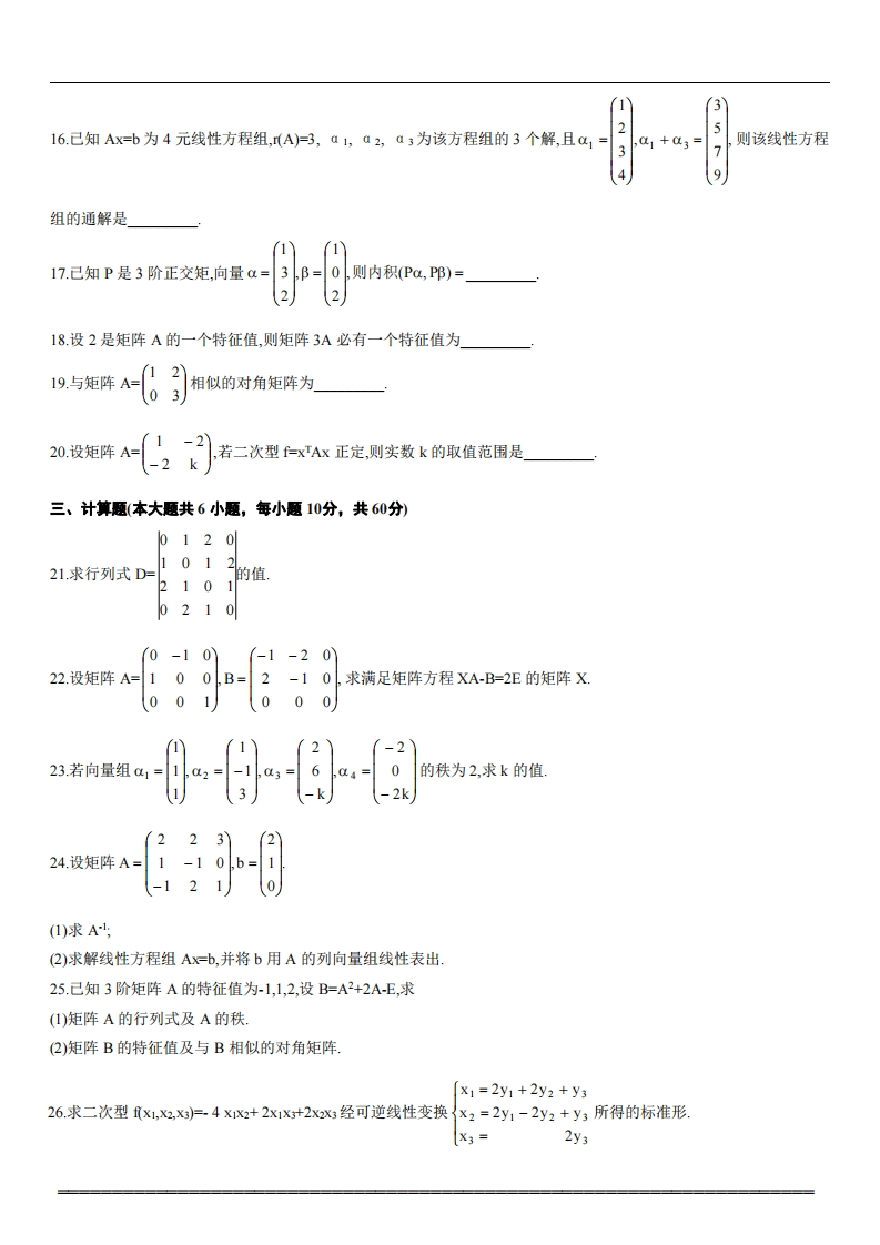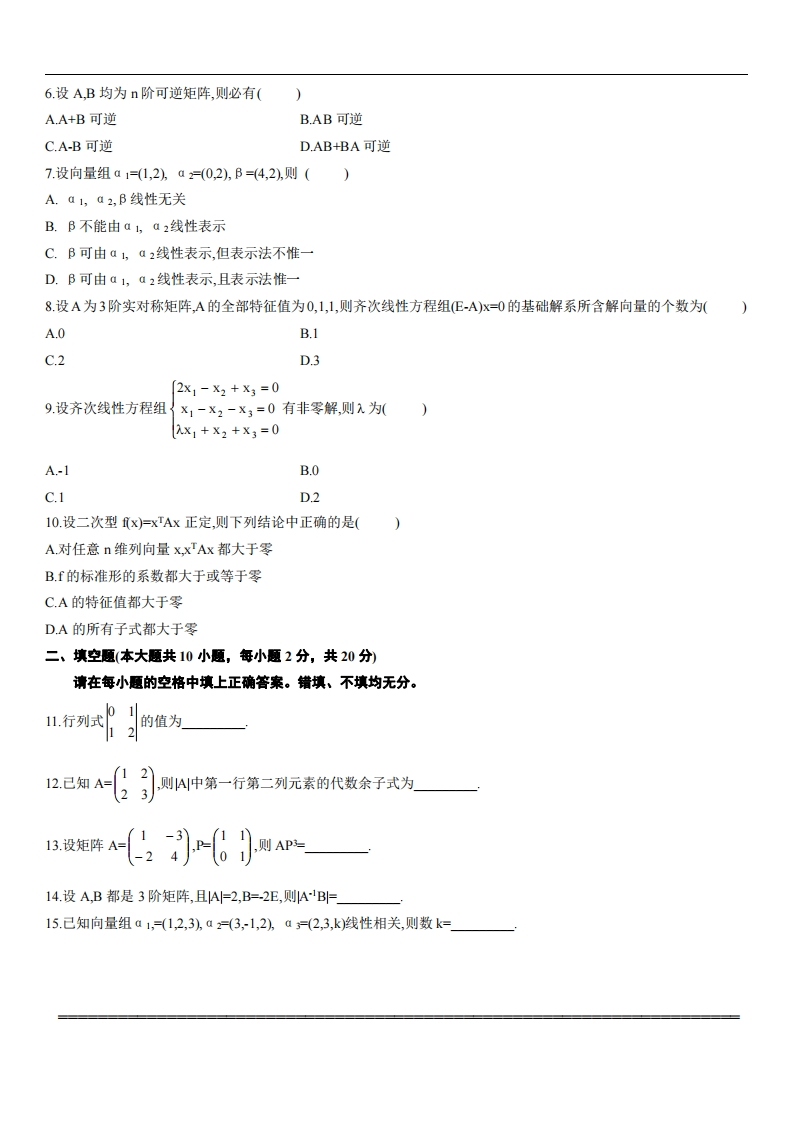 华北电力大学《线性代数》2022-2023第一学期期末考试试卷说明:在本卷中,AT表示矩阵A的转量矩阵,A表示矩阵A的伴随矩阵,E是单位矩阵A表示方阵A的行列式,(A)表示矩A的秩一、单项选择题(本大题共10小题,每小题2分,共20分)在每小题列出的四个备选项中只有一个是符合愿目要求的,请将其代码填写在题后的括号内。错选、多选或未选均无分。1.设A为3阶矩阵,AF1,则2AT=(A.-8B.-2C.2D.82.设矩阵AB=(1,1),则AB=(A.0B.(1,-1)(3.设A为n阶对称矩阵,B为n阶反对称矩阵,则下列矩阵中为反对称矩阵的是(A.AB-BABAB+BAC.ABD.BA4.设矩阵A的伴随矩阵A=234,则A1=()》A别aC到c-63n6司5.下列矩阵中不是初等矩阵的是(101(001A.010B010000100(100C030D010001201