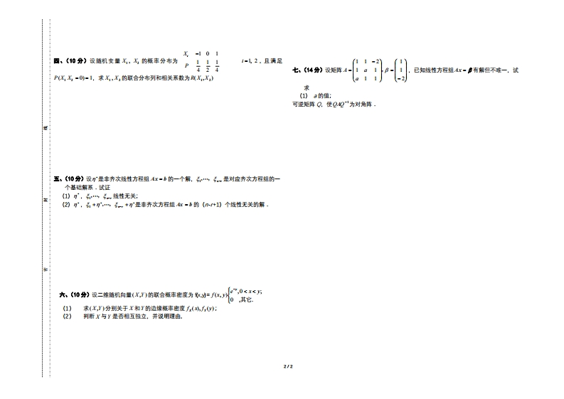华东理工大学二、进部■(每小厘4分,共24分)1、设总体X在(肚一P,4+P)上服从均匀分布,则参数肚的矩估计量为2022一2023学年第一学期期米考试(A《线性代数》考生诚信考试承诺:2、设n阶矩醉4与8等价,则必有间当4-a.(a*0时.-a:间当-a.(a¥0时,回--a:0考试过程不携带、不使用手机,当40时,同-0:(0当4-0时,-0.考试过程中不交头接耳。保证考场纪律。考试过程中不携著据条以及任何有关考试料日的东西,3、甲、乙、丙三人各自鞋立的向一目标射击一次,三人的命中率分别是05,06.Q7,则目数考试过程中严格暖从监考老师的格令。标被击中的概率为(A)Q94:(8)092:(C)095:(0)00注意:1、请考生仔烟检查试春,如有植、漏、疏现条请对报齿监考老师更换.2、请特答案填写到答题卡指定位盟,试在爸题无数,4、丰齐次线性方程组A8X=b有丰零解是最件成立(A]ankA=5:B)rn4)=5,3、请,生句进,生被信名试承诺,8nk4中41b=5:D)rank4年ran《4|bj=44、老试时间:20分钟。5、设A8皆为n阶方阵,则以下结论正确的是一、填空夏《每小厘4分,共24分》1A)若AB皆可逆,即4+8也可逆:诺AB皆可逆,即4B也可逆:1、随机安量《~N%),则-小知)C诺A+B皆可逆,则A-B也可逆;D)诺A+B可逆,则AB皆可逆.2设矩阵4-26、设A为三助矩群,将4的第二行加到第一行得B,再将8的第一列的-1倍加到第二列得/为二阶单位降,矩阵8满足4=8+2X,8=-121110f01001C,记P-010,则0010(001!3、设矩阵A■则4的珠为」0001间C-PAP(商C-PP1gC-P'APC-PP00004、设X和了是相互鞋立的两个随机变量,且X服从《-1,2)上的均匀分布,了W(,4),则E(灯)-」100021002三、得分)计算行列式印121可的值5、设行列式即第四行各元素的代数余子式之和为=7001213-22p00126、设三助矩群A的特征值为1、2、3,则4的转置件通阵A”的行列式为1/2
