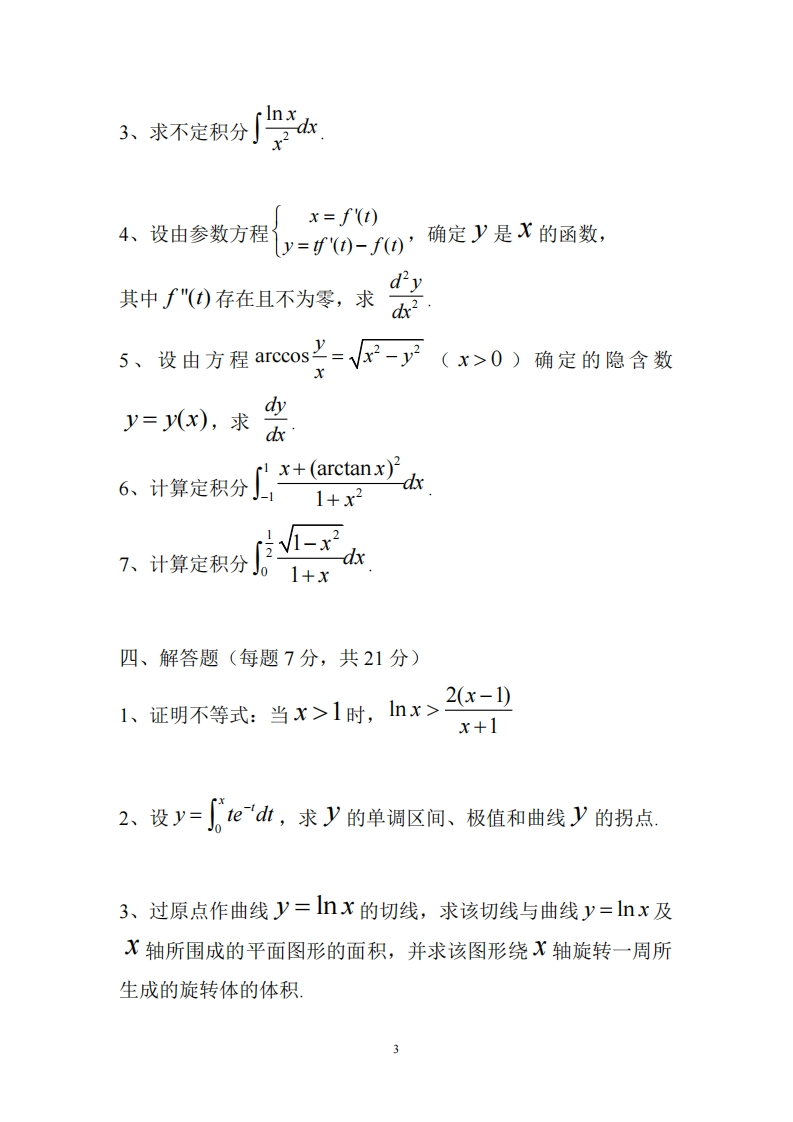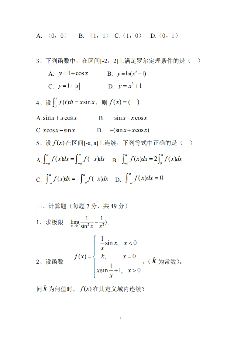 华南农业大学期末考试试卷(C卷)2017学年第1学期高等数学(工科)考试时间:120分钟一、填空题(每题3分,共15分)1、函数y=lnr-3x-4的定义域是e2、极限im2+=003、设y=(arccos},则dy=4、不定积分+oe*dx5、反常积分Je2x+1二、单项选择题(每题3分,共15分)x21、设f(x)=in-,x≠0X,则f(x)在点x=0处()0,x=0A.limf(x)不存在Y-B.limf(x)存在,但f(x)在点x=0处不连续50C.f'(0)存在D.f(x)在点x=0处连续,但不可导2、设曲线y=x十x一2在点M处的切线斜率为3,则点M处的坐标为()