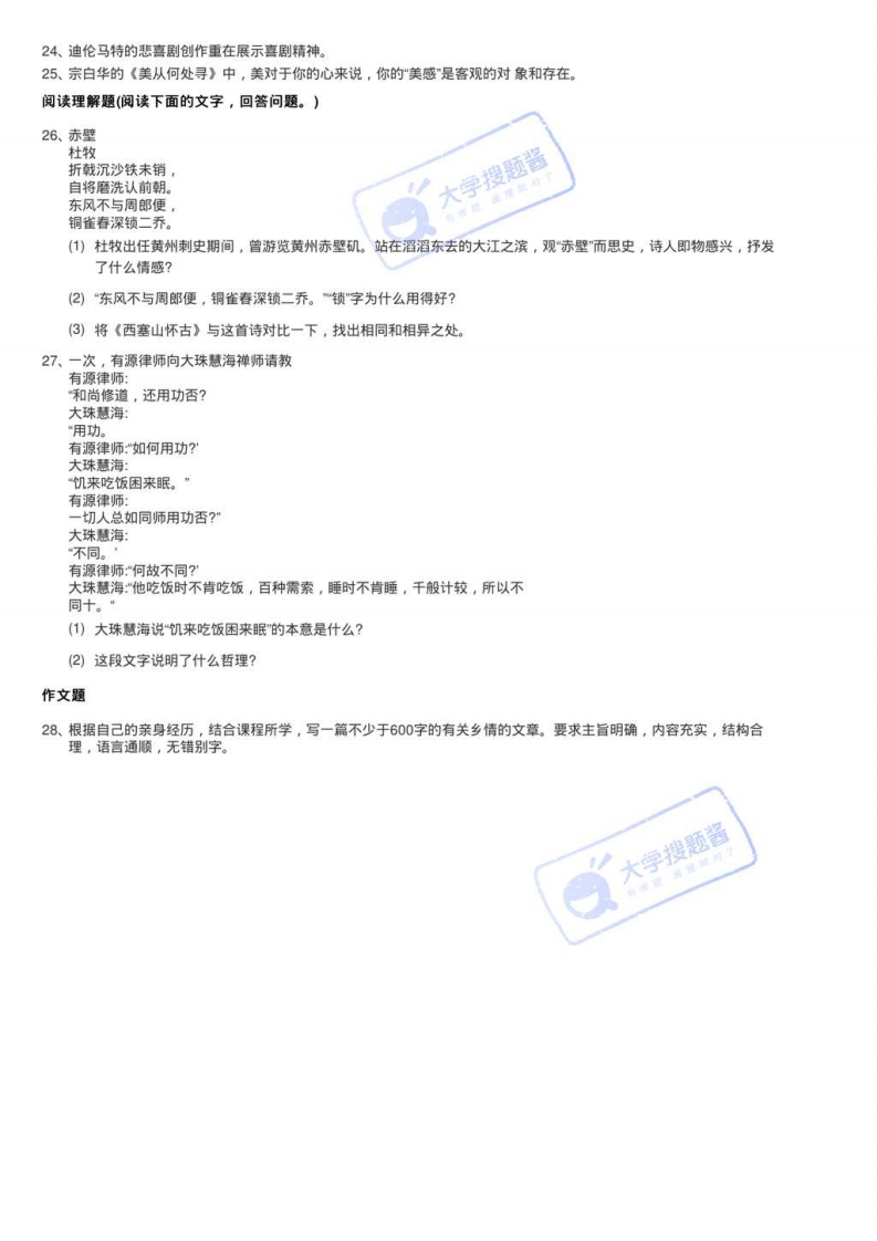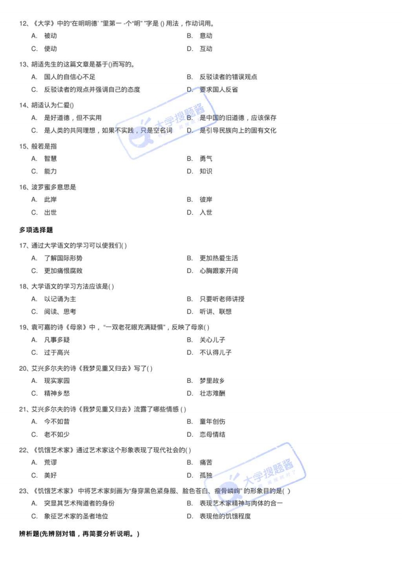 华南农业大学2021年第一学期期末试卷A卷(大学语文)单项选择题1、大学语文课程教学的主要目的是0A.提高写作水平B.深化中学语文C.增强人文修养D了解中国文学发展史2、艾兴多尔夫是19世纪后期0的杰出代表A.浪漫派B.湖畔派。C.自然主义D.现实主义3、“任何人对他都变得不复存在,连笼子里那对他至关重要的钟表发出的响声也充耳不闻"(《饥饿艺术家》)表现了艺术家对艺术0的态度A.无所谓B.恐惧C.痛苦D.忘我4、张爱玲的《封锁》中,“开电车的人眼睛盯住了这两条蠕蠕的车轨,然而他不发疯。"是因为0A.没有人会因为这样而发疯的。B.大部分都会疯。C.人已经处在一个仅仅能够生存的极限状态了。D.作都认为如果是她肯定疯了。5、《伯夷列传》中的伯夷与叔齐死于哪座山上?A.华山B.首阳山C.嵩山D.泰山6、鲁迅的《复仇》一文最早发表在()A.《小品文》B.《新青年》C.《莽原)D.《语丝》7、汪莘的诗《黄山高》是模仿0。A.李白《将进酒》B.李白《蜀道难C.白居易《长恨歌)D.白居易《琵琶行》8、对《西塞山怀古》诗眼叙述正确的是0A.王濟楼船下益州,金陵王气黯然收。B.干寻铁锁沉江底,一片降潘出石头。C.人世几回伤往事,山形依旧枕寒流。D.今逢四海为家日,故垒萧萧芦荻秋。9、沃尔特惠特曼的代表作0A.《西风颂》B.《草叶集》C.《飞鸟集》D.《自由颂》10、《蚊对》通过天台生的责骂与童子的对答说明0A.天台生是蛮恨的。B.童子是错误的。C.蚊子是令人可恨的D.蚊子是应该跟人类是平等的。11、《美从何处寻》的作者宗白华是中国现代文学史上著名的A.想家B.学家C.治家D.学家