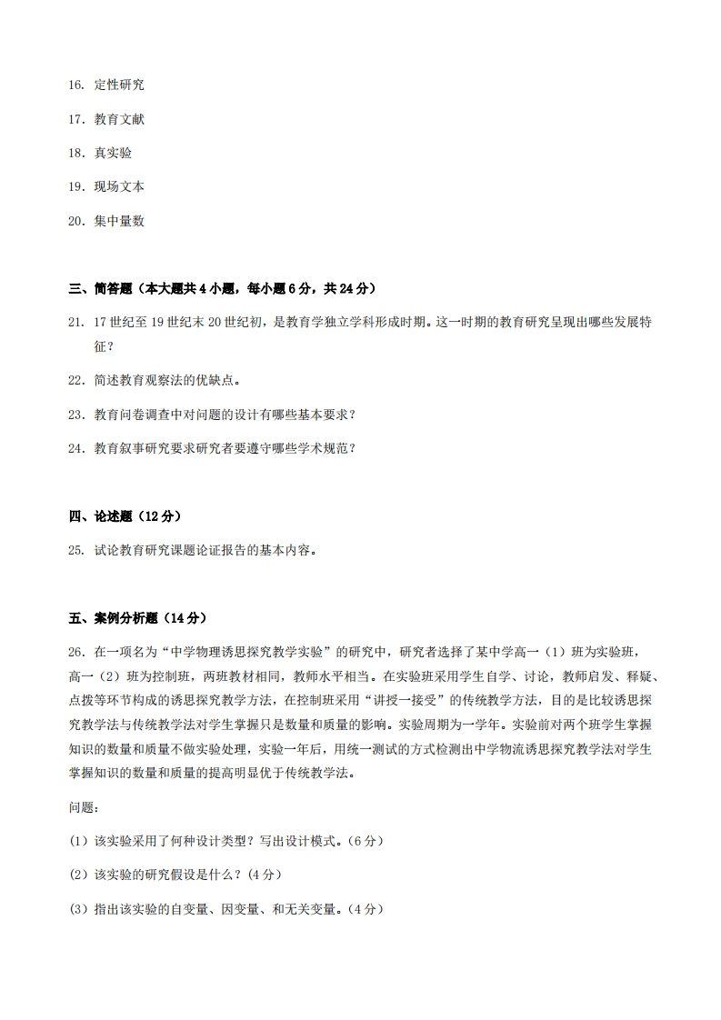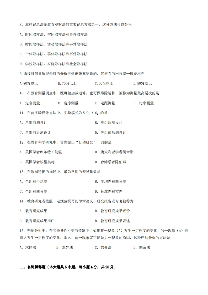 华南师范大学《教育研究方法》2020一2021学年第一学期期末试卷一、单项选择题(本大题共15小题,每小题2分,共30分)在每小题列出的四个备选项中只有一个是符合题目要求的,请将其选出并将“答题纸”的相应代码涂黑。错涂、多涂或未涂均无分。1.哲学思潮是教育研究方法论的理论基础之一。20世纪上半叶在教育研究领域占主导地位的是A.后现代主义思潮B.科学主义思潮C.存在主义思潮D.人本主义思潮2.某学者发现其研究课题中的核心概念在学术界尚有争议,于是在研究报告中对核心概念作出了自我界定,并将这一定义贯彻到底。他这是遵循了教育研究的A.操作性原则B.检验性原则C.公共性原则D.客观性原则3.对教育本质、教育功能的研究属于A.基础研究B.应用研究C.评价研究D.预测研究4.教育研究课题的选择原则中,首先要考虑的是A.课题要有价值B.课题要有科学性C.课题要有创造性D.课题要有可行性5.计算机检索是教育文献检索的重要方法之一,它包括两种途径,一种是在线检索,另一种是A.线外检索B.查询检索C.数据库检索D.专题检索6.一般来说,专著、期刊论文、学位论文、会议论文、研究报告等属于A.零次文献B.一次文献C.二次文献D.三次文献7.具有明确的观察目的和范围、详细的观察计划和观察指标体系的可控性观察方法被称为A.直接观察法B.间接观察法C.结构性观察法D.非结构性观察法