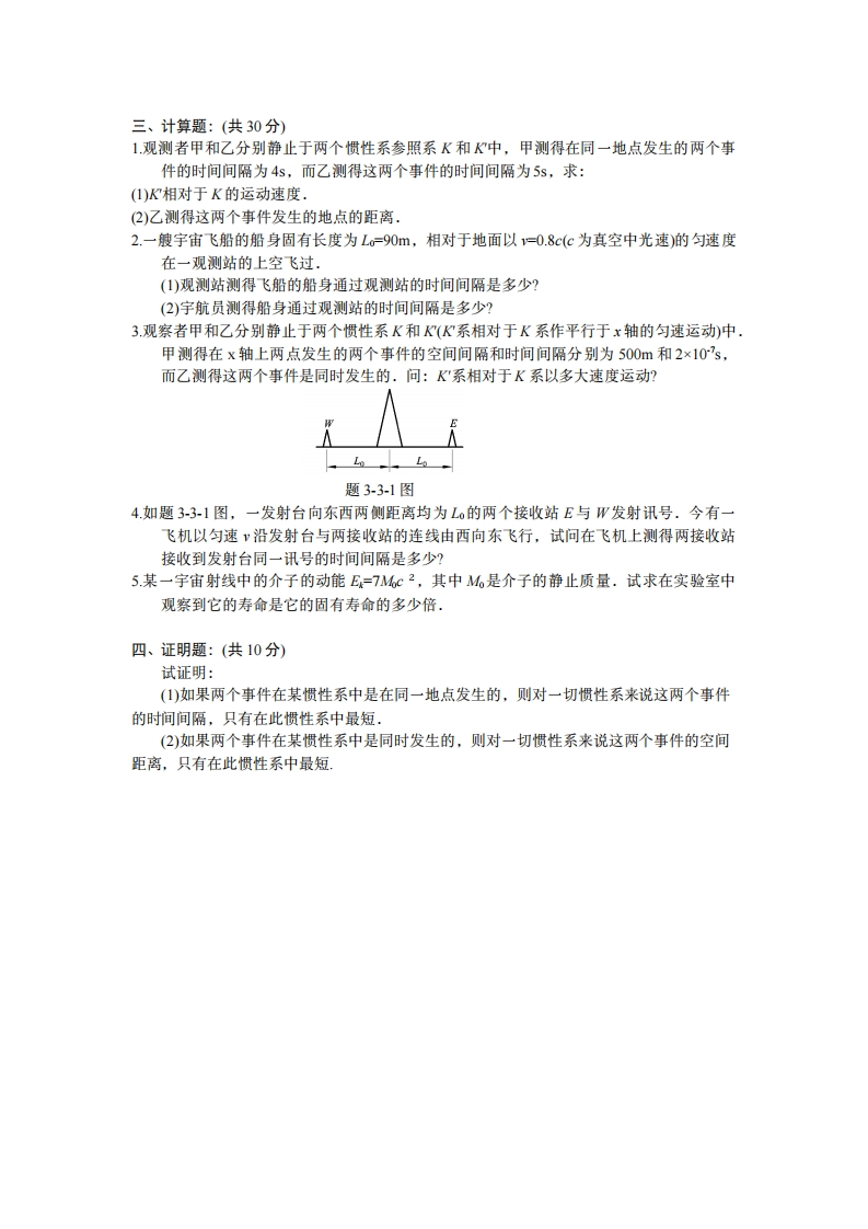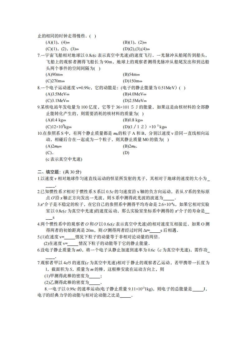 华中科技大学《大学物理》2020-2021第2学期期末试题一、选择题:(共30分)1.一火箭的固有长度为L,相对于地面作匀速直线运动的速度为1,火箭上有一个人从火箭的后端向火箭前端上的一个靶子发射一颗相对于火箭的速度为V2的子弹.在火箭上测得子弹从射出到击中靶的时间间隔是()(A)L(B)LV1+2V2(©LL(D)2%V1-(y/c)2(c表示真空中光速)2.宇宙飞船相对于地面以速度ν作匀速直线飞行,某一时刻飞船头部的宇航员向飞船尾部发出一个光讯号,经过△飞船上的钟)时间后,被尾部的接收器收到,则由此可知飞船的固有长度为()(A)c△m(B)v△1.(C).(D)c△.(c表示真空中光速)3.有一直尺固定在K系中,它与Ox轴的夹角=45°,如果系以速度u沿Ox方向相对于K系运动,K系中观察者测得该尺与Ox轴的夹角()(A)大于45(B)小于45°(C)等于45.(D)当系沿Ox正方向运动时大于45°,而当系沿Ox负方向运动时小于45°4.(1)对某观察者来说,发生在某惯性系中同一地点、同一时刻的两个事件,对于相对该惯性系作匀速直线运动的其他惯性系中的观察者来说,它们是否同时发生?(2)在某惯性系中发生于同一时刻、不同地点的两个事件,它们在其他惯性系中是否同时发生?关于上述两个问题的正确答案是:()(A)(1)同时,(2)不同时(B)1)不同时,(2)同时.(C)1)同时,(2)同时.(D)1)不同时,(2)不同时5.根据相对论力学,动能为1/4MeV的电子,其运动速度约等于()(A)0.1c.(B)0.5c.(C)0.75c.(D)0.85c.(c表示真空中的光速,电子静能moc2=0.5MeV)6.在狭义相对论中,下列说法中哪些是正确的?(1)一切运动物体相对于观察者的速度都不能大于真空中的光速.(2)质量、长度、时间的测量结果都是随物体与观察者的相对运动状态而改变的(3)在一惯性系中发生于同一时刻,不同地点的两个事件在其他一切惯性系中也是同时发生的.(④)惯性系中的观察者观察一个与他作匀速相对运动的时钟时,会看到这时钟比与他相对静