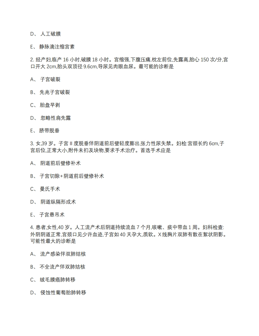 华中科技大学2019-2020学年第一学期临床医学专业《妇产科学》试卷(卷面100分,占总成绩%)考试日期:年月日考试时间:考试方式:闭卷题号二三四总分得分如登分人分人考试说明:1、请将选择题部分答案全部填涂在答题卡上,写在试卷上一律无效。其余试题的答案写在试卷上。2、请在答题卡上填涂好姓名、班级、课程、考试日期、试卷类型和考号。试卷类型划A;考号为学号,请填涂在“考号”的九个空格并划线。3、答题卡填涂不符合规范者,一切后果自负。4、70分钟收取答题卡。所有试卷不得带出考场外,否则以违纪论处。别一、名词解释(总共5题,每题3分,共15分。)1.仰卧低血压综合征2.产褥感染童3.产褥病率4.子宫脱垂5.异位妊娠二、单选题(总共30题,每题1分,共30分。)1.不协调性子宫收缩乏力的正确处理应是A、针刺合谷、三阴交穴位B、温肥皂水灌肠C、肌注哌替啶