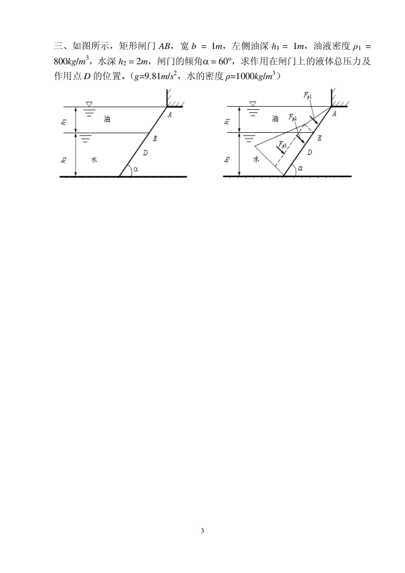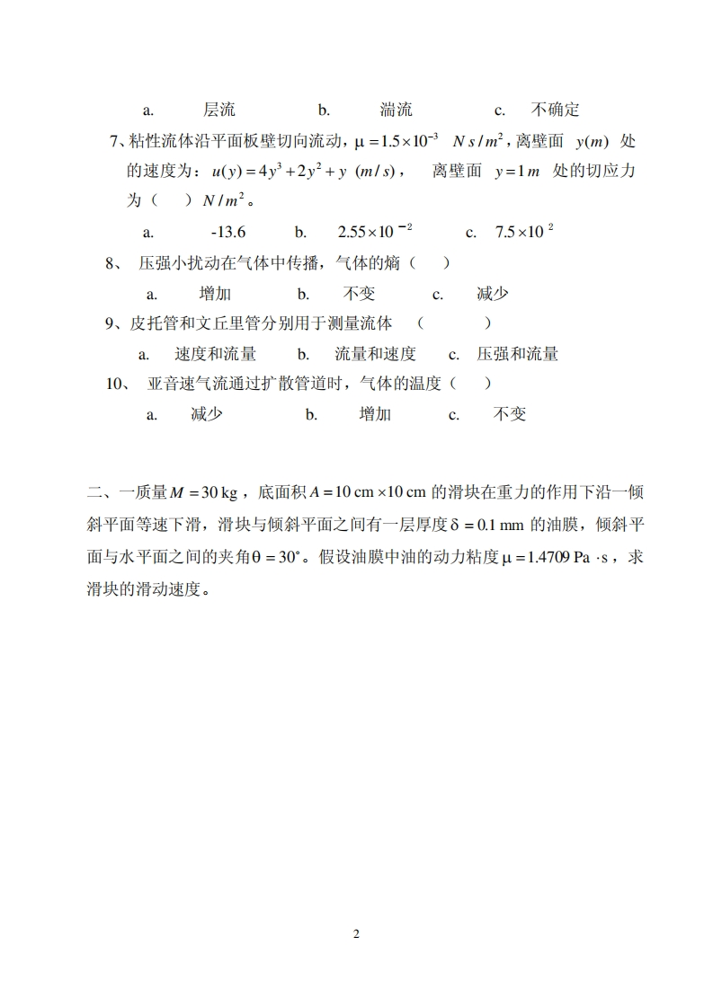 华中科技大学计算机类2020~2021学年第一学期“流体力学”考试试卷(A卷)考试方式:闭卷考试日期:2021年1月5且考试时长:150分钟专业班级:学号:姓名:题号二三四五六七八九总分分数一、概念选答题(20分(只有一个最佳答案解答1、静止水库中,计算曲面受力的压力体()内容a.必须充满水b不能有水不确定不2、温度降低时,气体的粘性系数()不得超a.下降b.确定c.升高过装3、管道水击压力波的速度与水流速度相比订a.大体相等b.小很多大很多线4、伯努利方程表示流体()守恒a.能量b.动量C.质量5、水在变截面圆管中定常流动,两个截面的直径比d,/d,=2,平均速度比V/V2=()a.2b.1/2c.1/46、水在圆管(D=0.1m)中流动,流量Q=0.01m3/s,运动粘性系数v=10-6m2/s,水的流动状态是()1