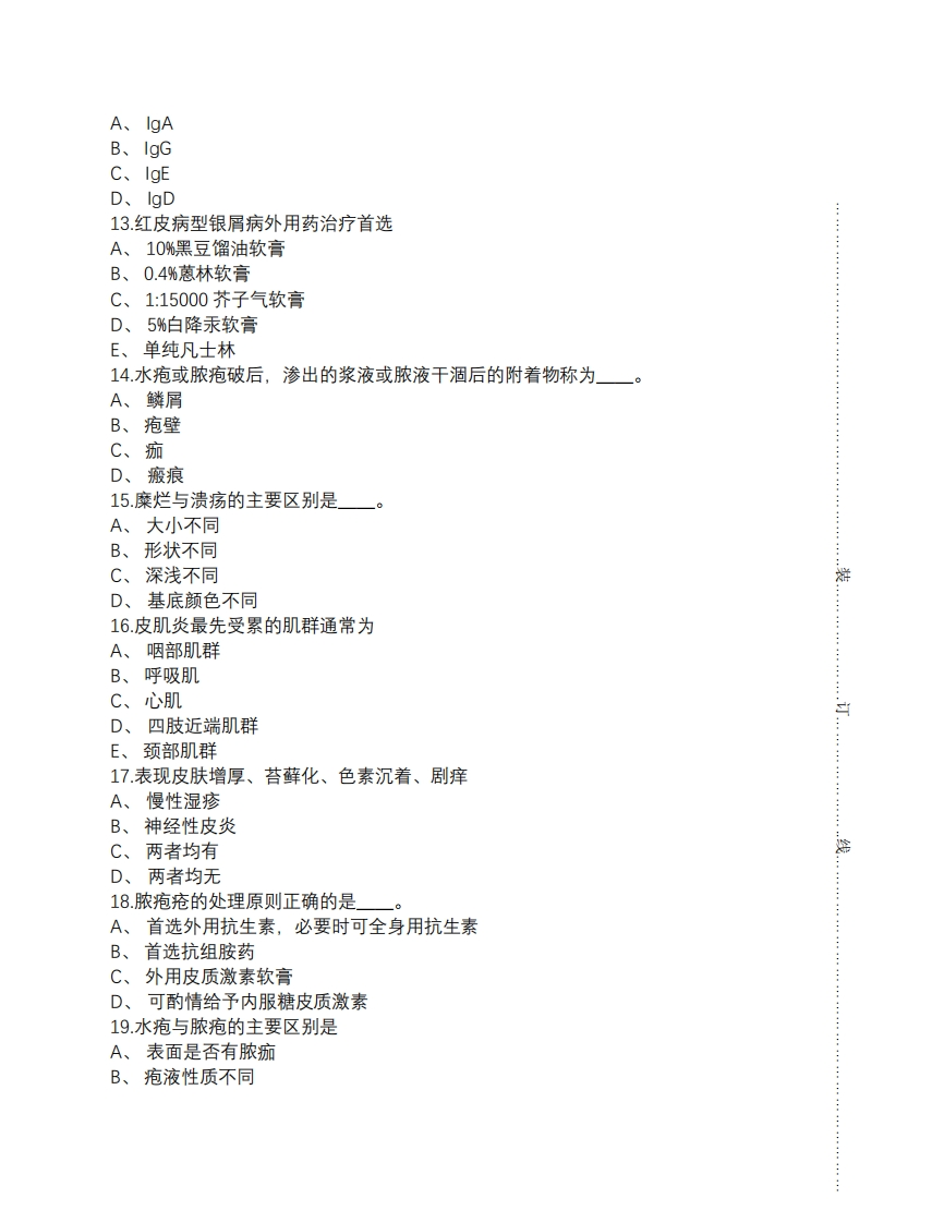 华中科技大学2021-2022学年第一学期临床医学专业《皮肤性病学》试卷(卷面100分,占总成绩%)考试日期:年月日考试时间:考试方式:闭卷题号二三四总分得分登分人核分人考试说明:1、请将选择题部分答案全部填涂在答题卡上,写在试卷上一律无效。其余试题的答案写在试卷上。2、请在答题卡上填涂好姓名、班级、课程、考试日期、试卷类型和考号。试卷类型划A;考号为学号,请填涂在“考号”的九个空格并划线。3、答题卡填涂不符合规范者,一切后果自负。即4、70分钟收取答题卡。所有试卷不得带出考场外,否则以违纪论处。一、单项选择题(每题1分,共30题,30分)1.尖锐湿疣好发于A、足跖部B、甲缘处C、头面部D、双手背E、皮肤与粘膜交界处量2.SLE发热、关节痛,治疗首选A、氨喹B、皮质类固醇激素C、左旋咪唑D、消炎痛E、硫唑嘌呤3.下列哪种是原发刺激物A、浓盐酸B、1:5000呋喃西林C、0.5%醋酸铅液D、氯霉素眼药水4.下列哪项不是慢性荨麻疹的临床表现()A、全身症状一般较轻B、反复发生达数月之久举C、风团时多时少